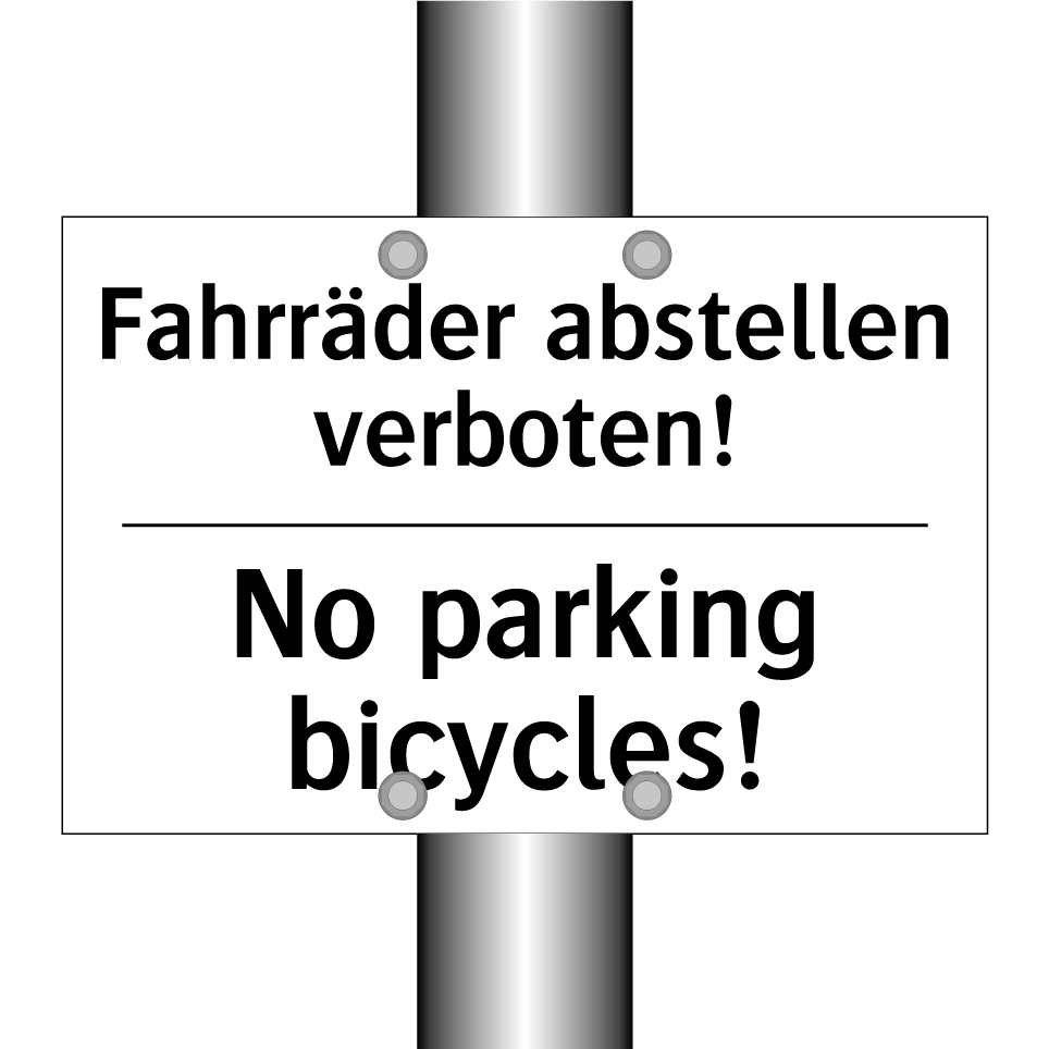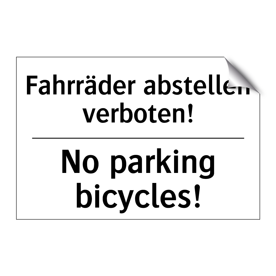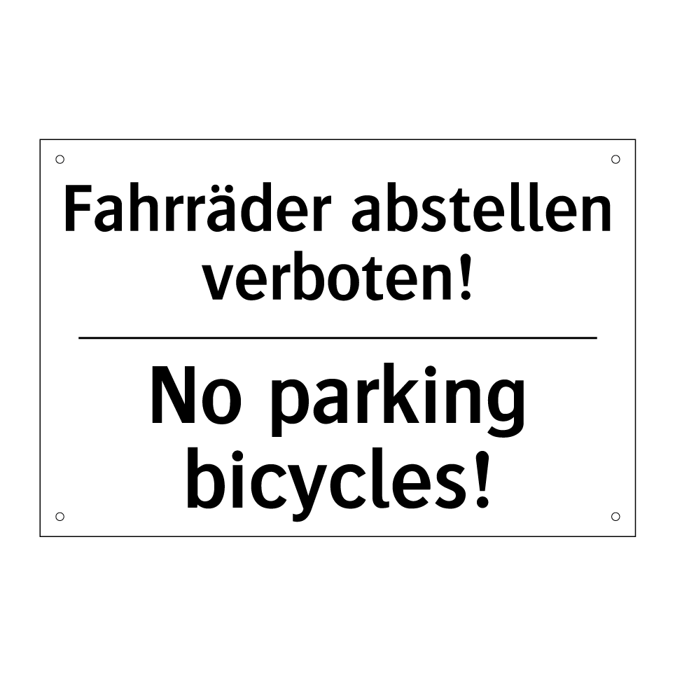 Zweisprachiges Verbotsschild mit deutschem Text Fahrräder abstellen verboten! und englischem Text No parking bicycles!
