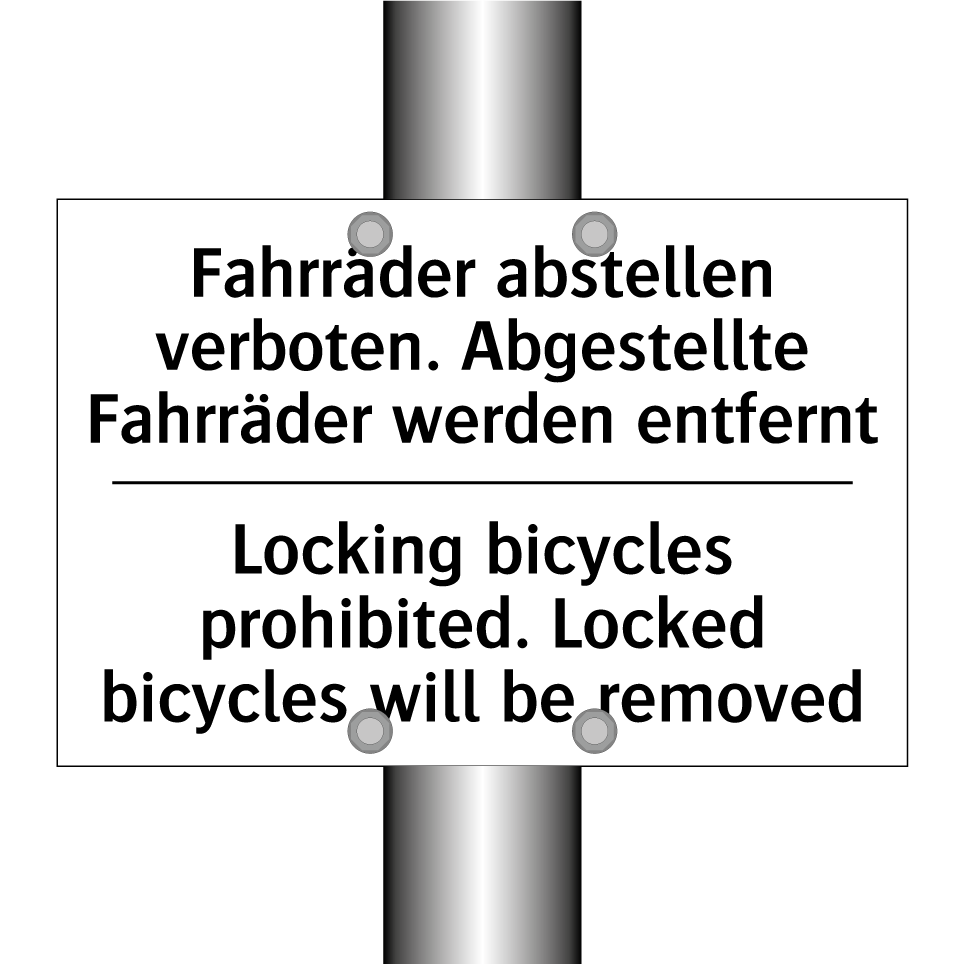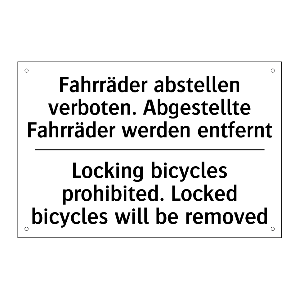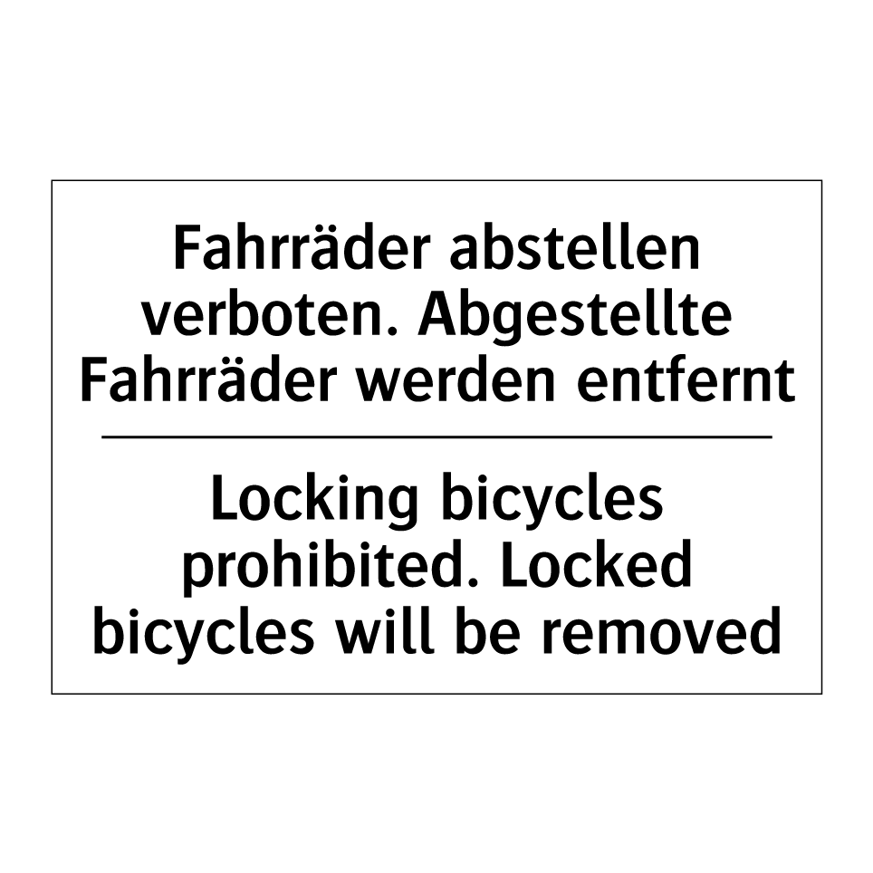 Zweisprachiges Verbotsschild mit deutschem Text Fahrräder abstellen verboten. Abgestellte Fahrräder werden entfernt und englischem Text Locking bicycles prohibited. Locked bicycles will be removed