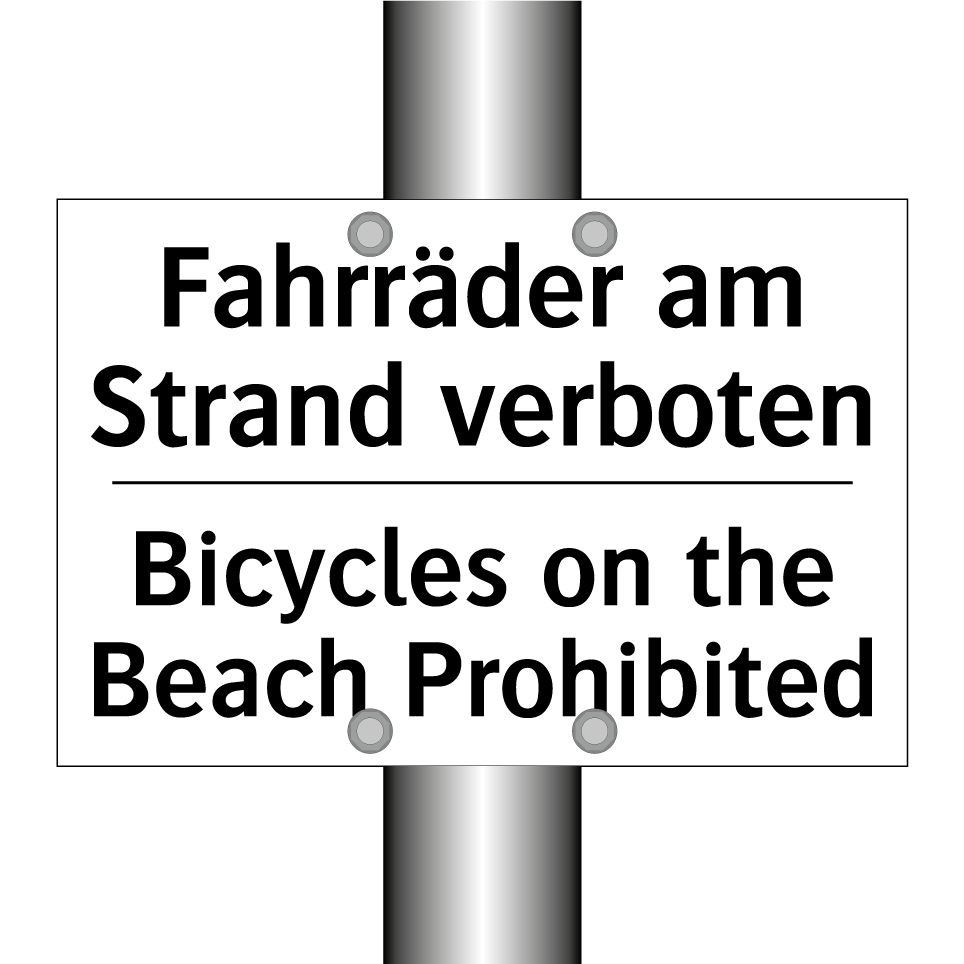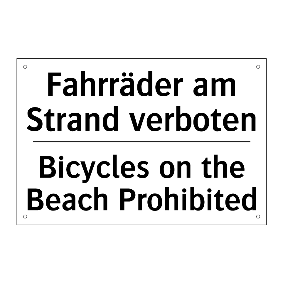 Zweisprachiges Verbotsschild mit deutschem Text Fahrräder am Strand verboten und englischem Text Bicycles on the Beach Prohibited