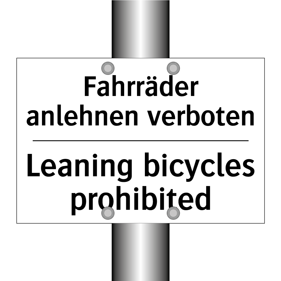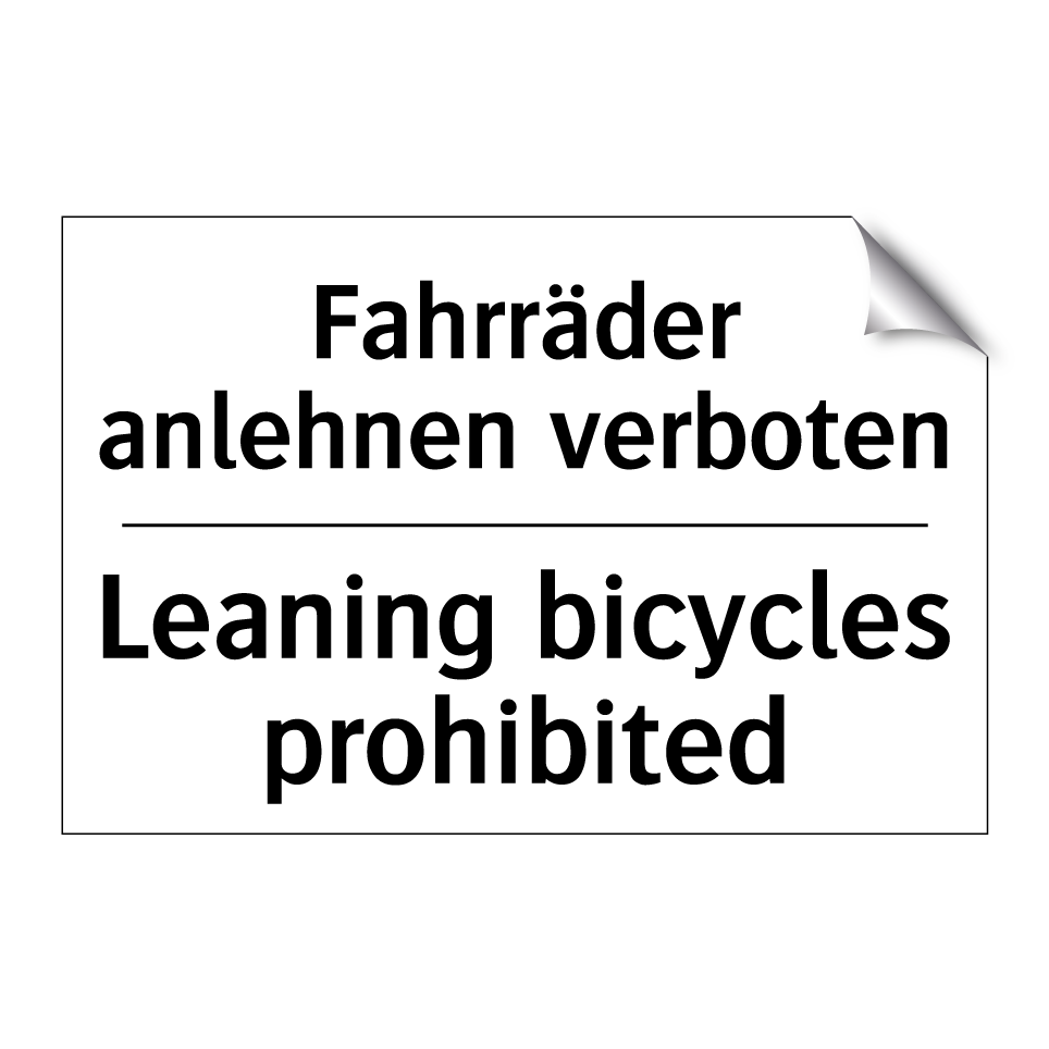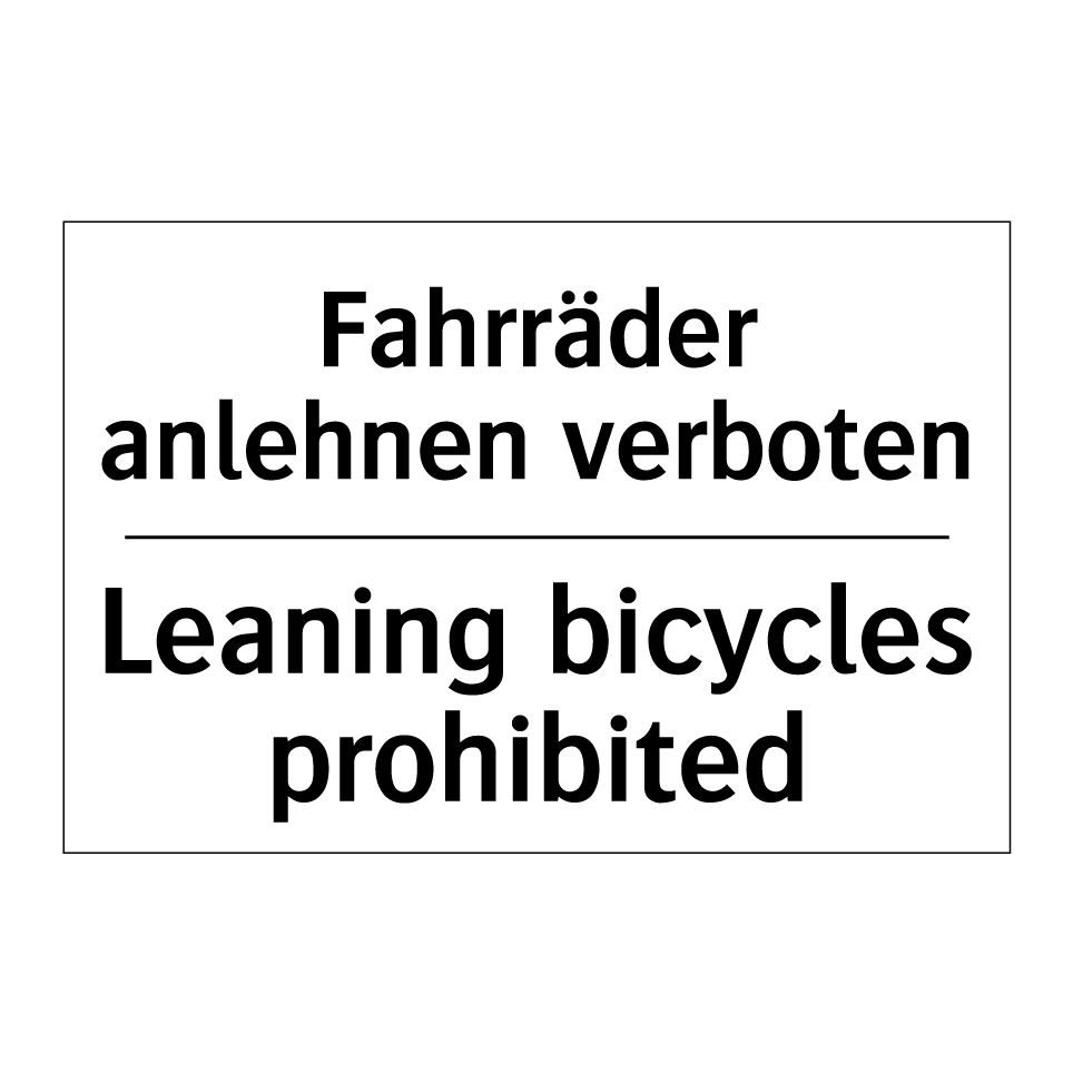 Zweisprachiges Verbotsschild mit deutschem Text Fahrräder anlehnen verboten und englischem Text Leaning bicycles prohibited