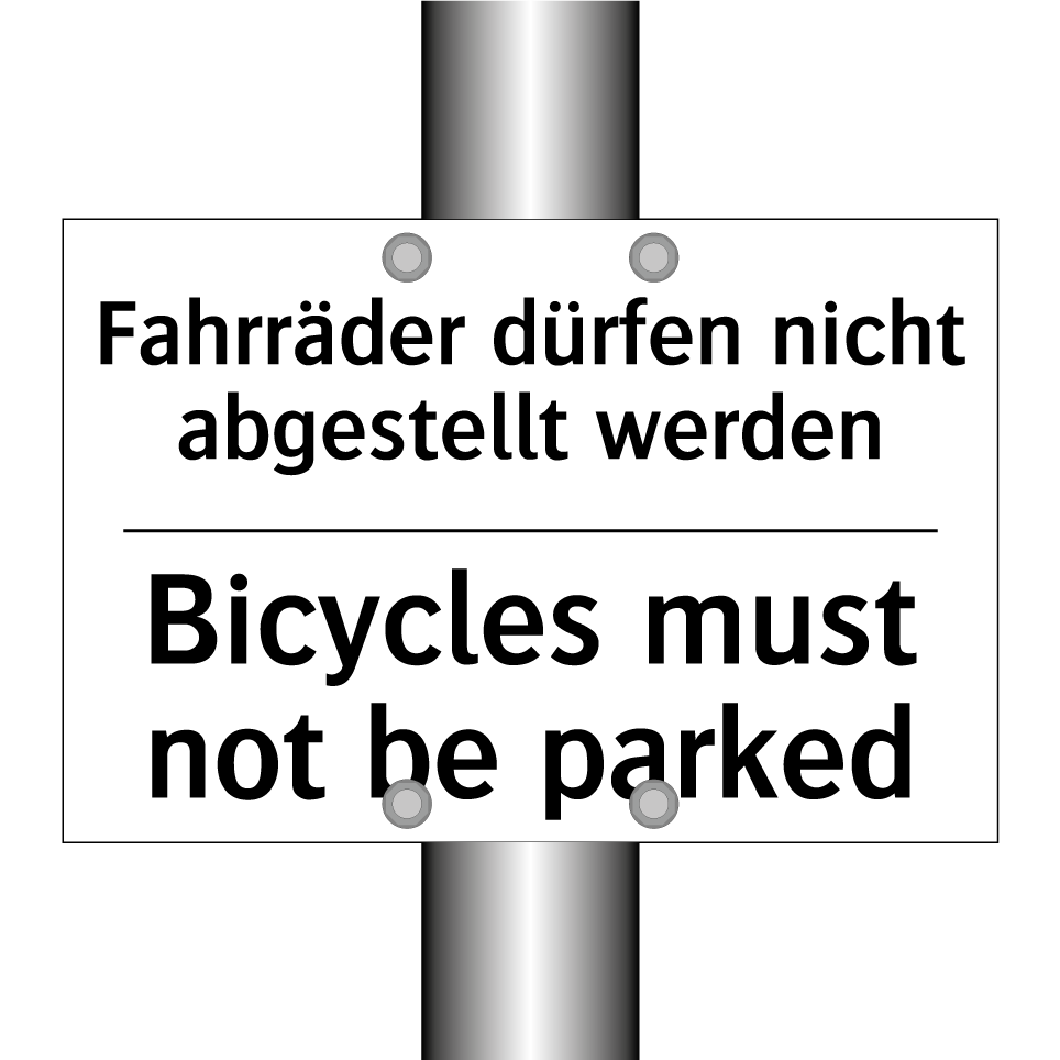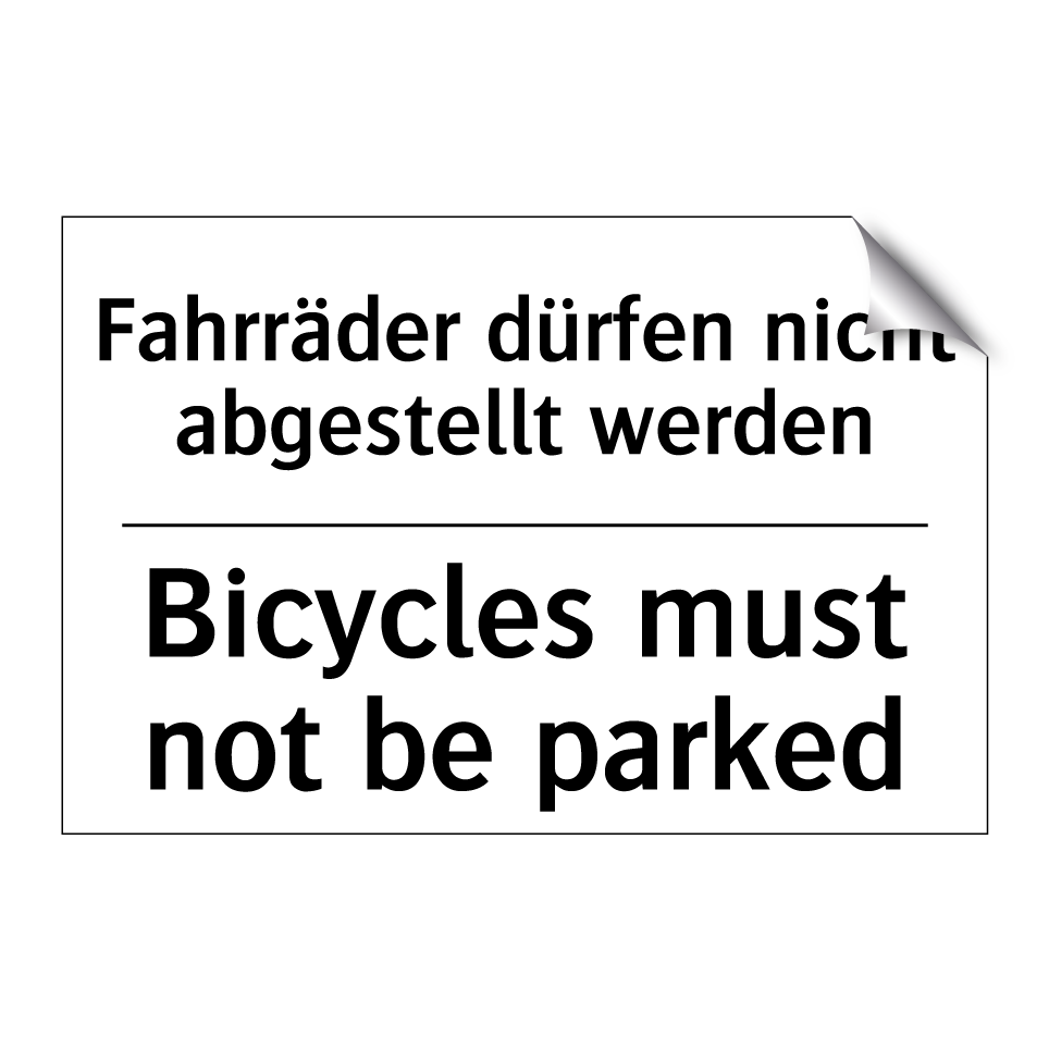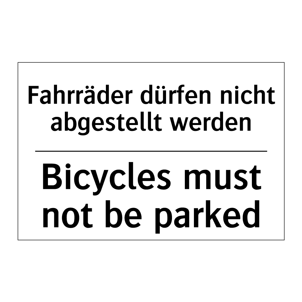 Zweisprachiges Verbotsschild mit deutschem Text Fahrräder dürfen nicht abgestellt werden und englischem Text Bicycles must not be parked