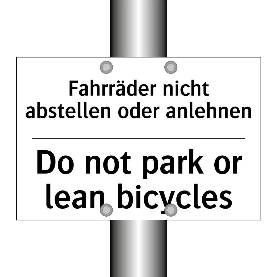 Zweisprachiges Verbotsschild mit deutschem Text Fahrräder nicht abstellen oder anlehnen und englischem Text Do not park or lean bicycles