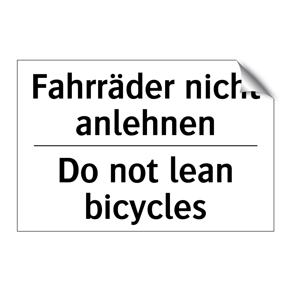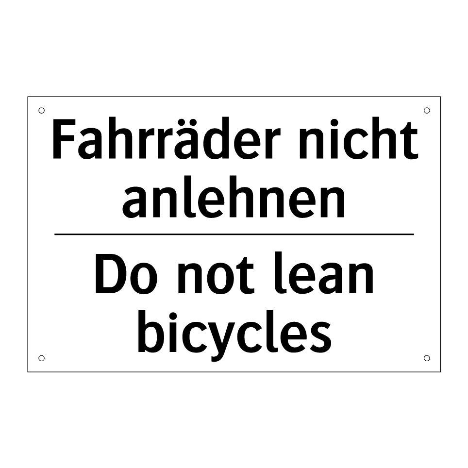 Zweisprachiges Verbotsschild mit deutschem Text Fahrräder nicht anlehnen und englischem Text Do not lean bicycles