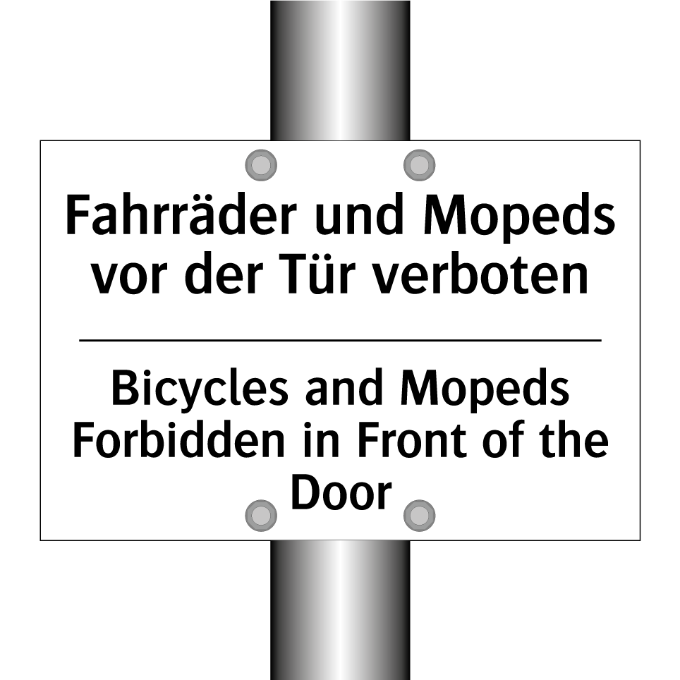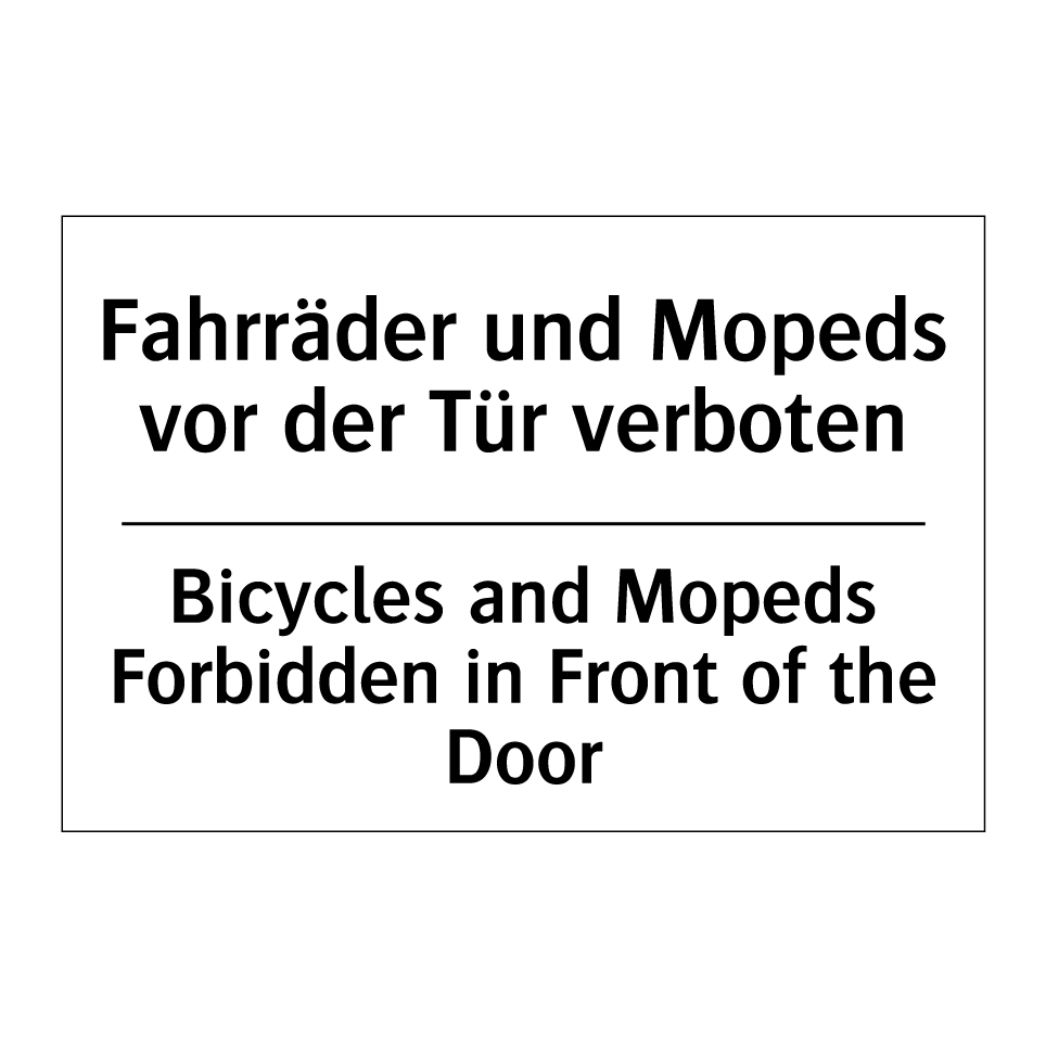 Zweisprachiges Verbotsschild mit deutschem Text Fahrräder und Mopeds vor der Tür verboten und englischem Text Bicycles and Mopeds Forbidden in Front of the Door