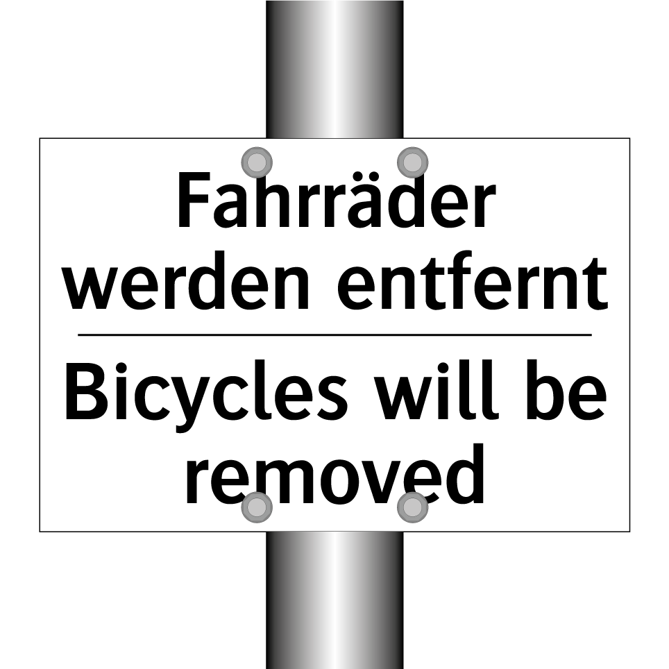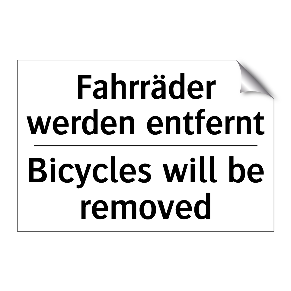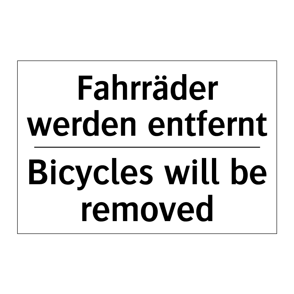 Zweisprachiges Verbotsschild mit deutschem Text Fahrräder werden entfernt und englischem Text Bicycles will be removed