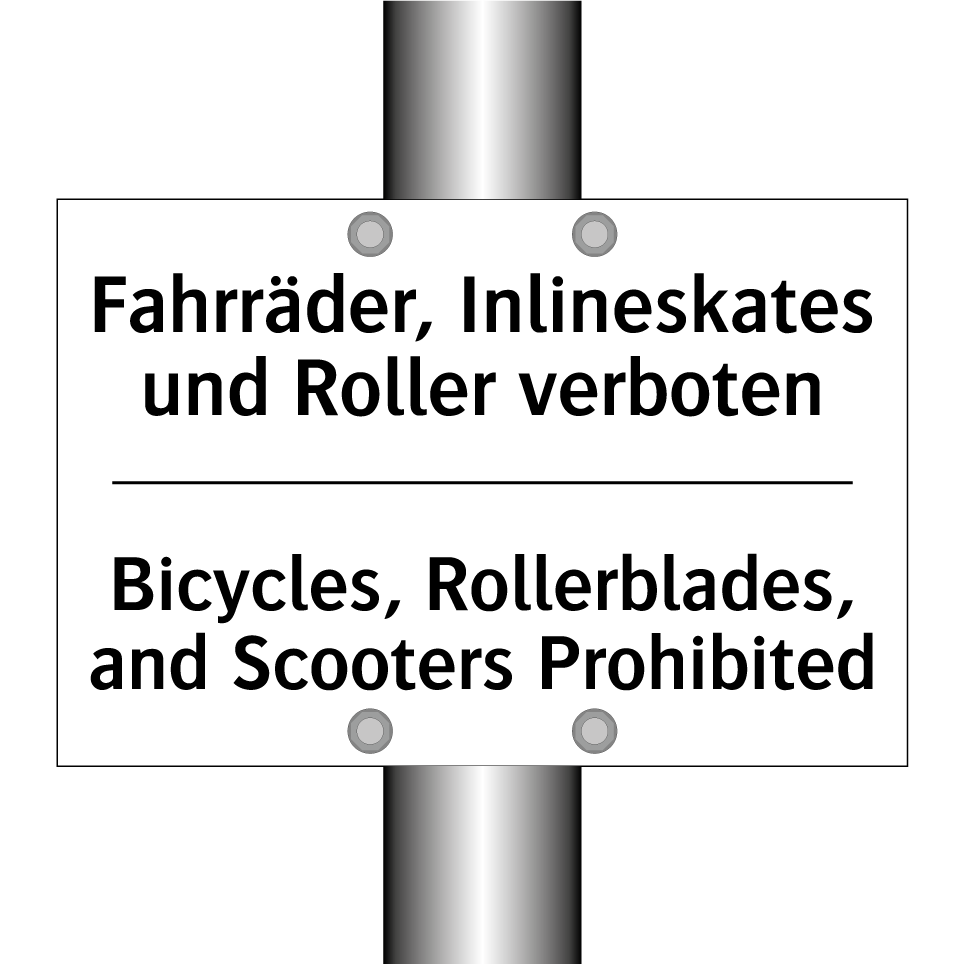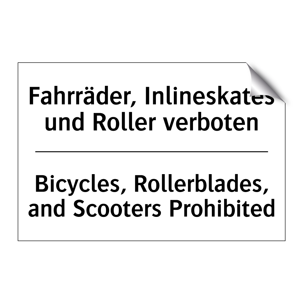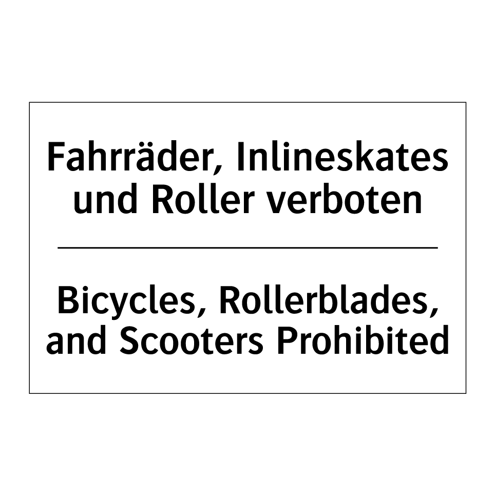 Zweisprachiges Verbotsschild mit deutschem Text Fahrräder, Inlineskates und Roller verboten und englischem Text Bicycles, Rollerblades, and Scooters Prohibited