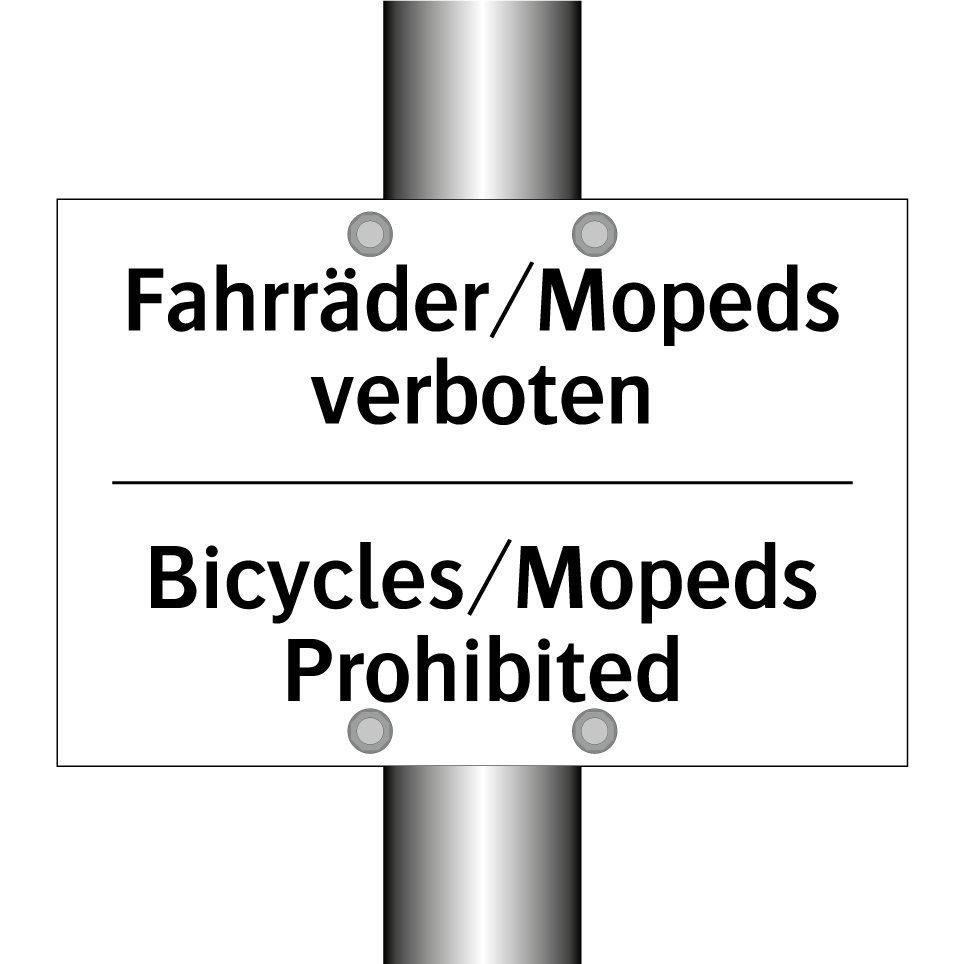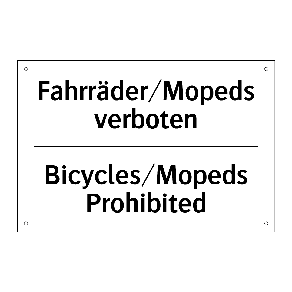 Zweisprachiges Verbotsschild mit deutschem Text Fahrräder/Mopeds verboten und englischem Text Bicycles/Mopeds Prohibited