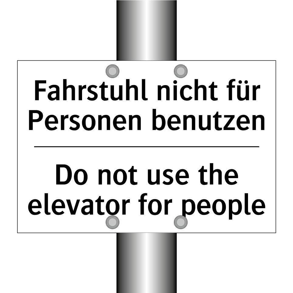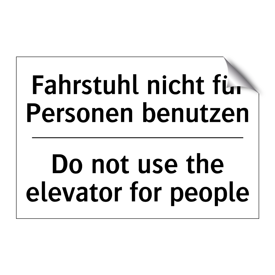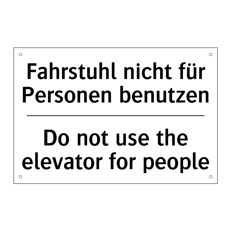 Zweisprachiges Verbotsschild mit deutschem Text Fahrstuhl nicht für Personen benutzen und englischem Text Do not use the elevator for people