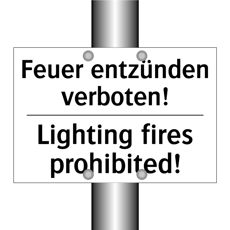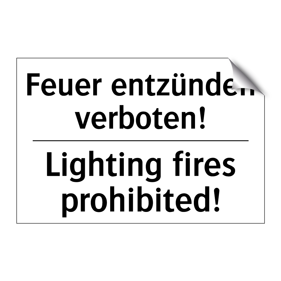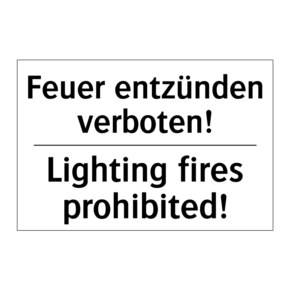 Zweisprachiges Verbotsschild mit deutschem Text Feuer entzünden verboten! und englischem Text Lighting fires prohibited!