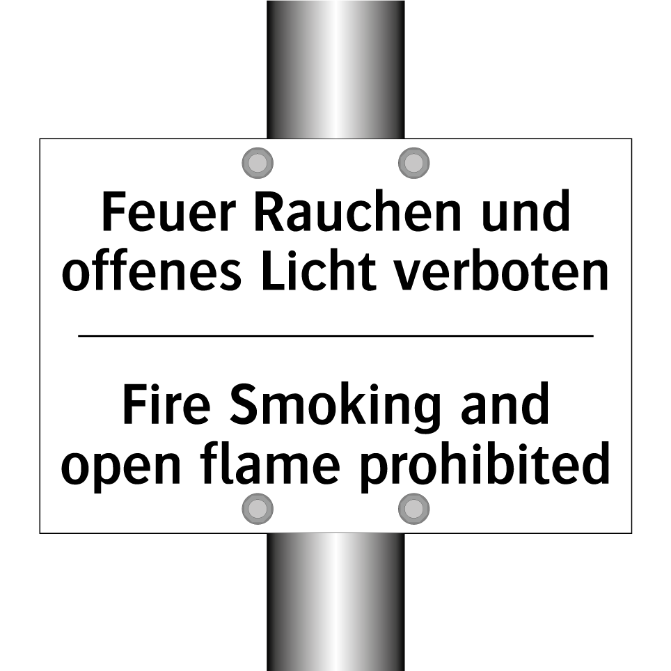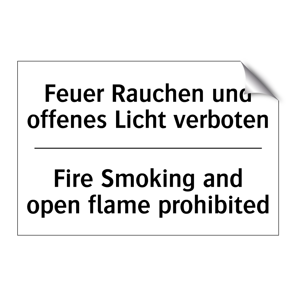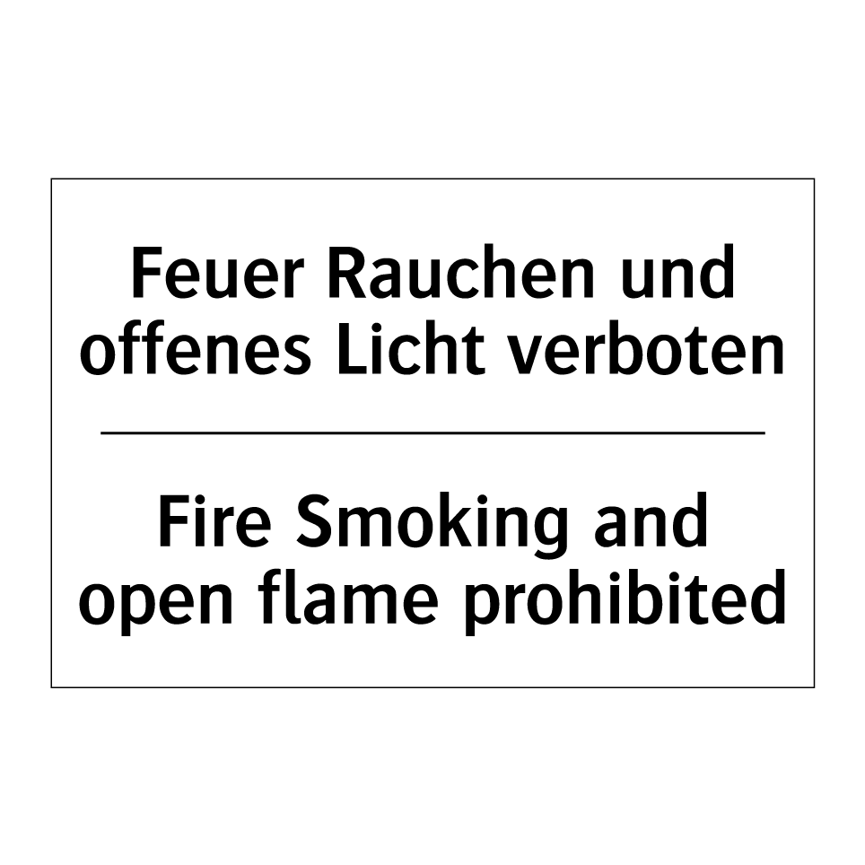 Zweisprachiges Verbotsschild mit deutschem Text Feuer Rauchen und offenes Licht verboten und englischem Text Fire Smoking and open flame prohibited