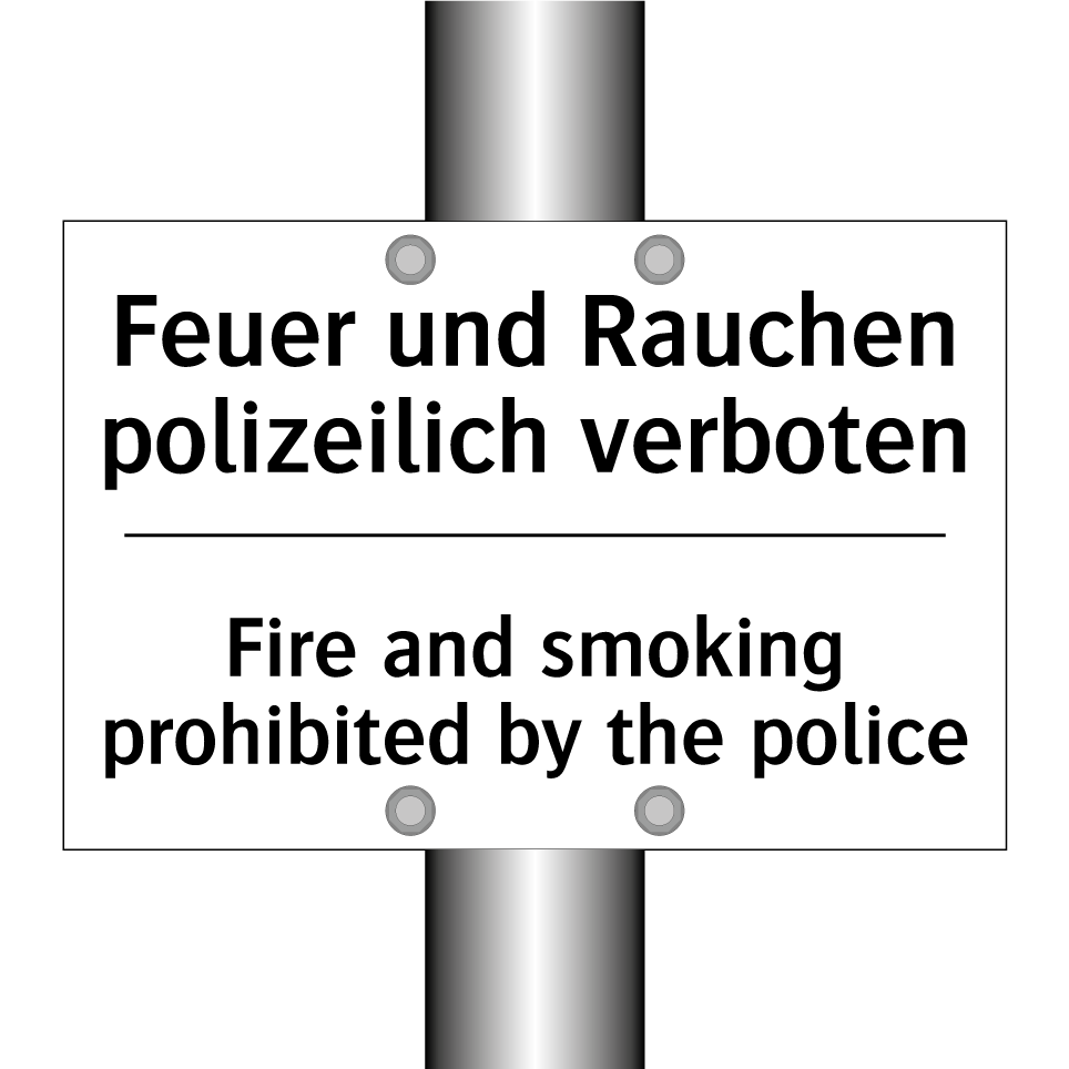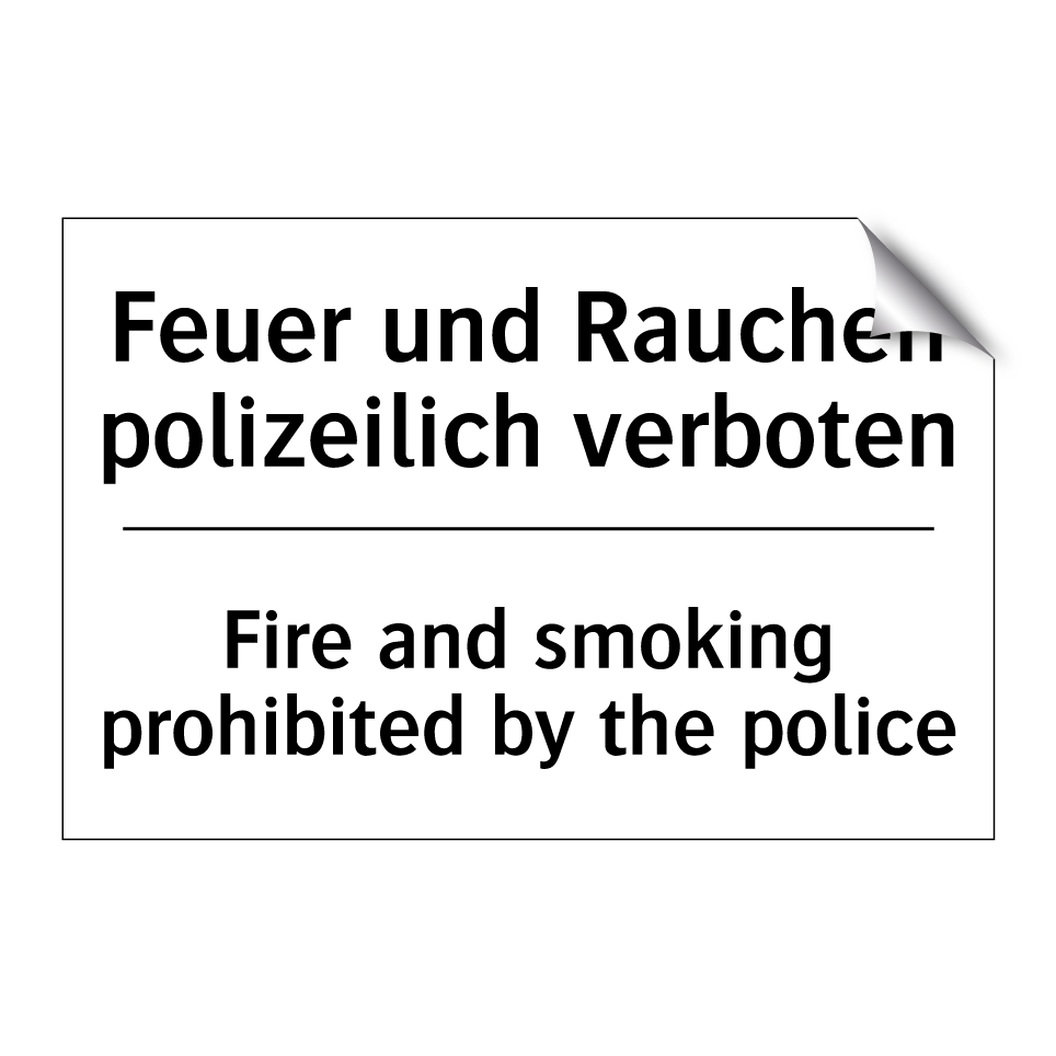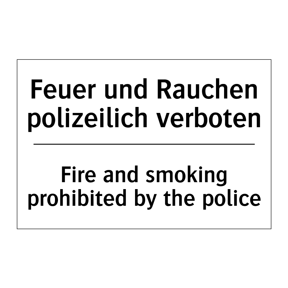 Zweisprachiges Verbotsschild mit deutschem Text Feuer und Rauchen polizeilich verboten und englischem Text Fire and smoking prohibited by the police