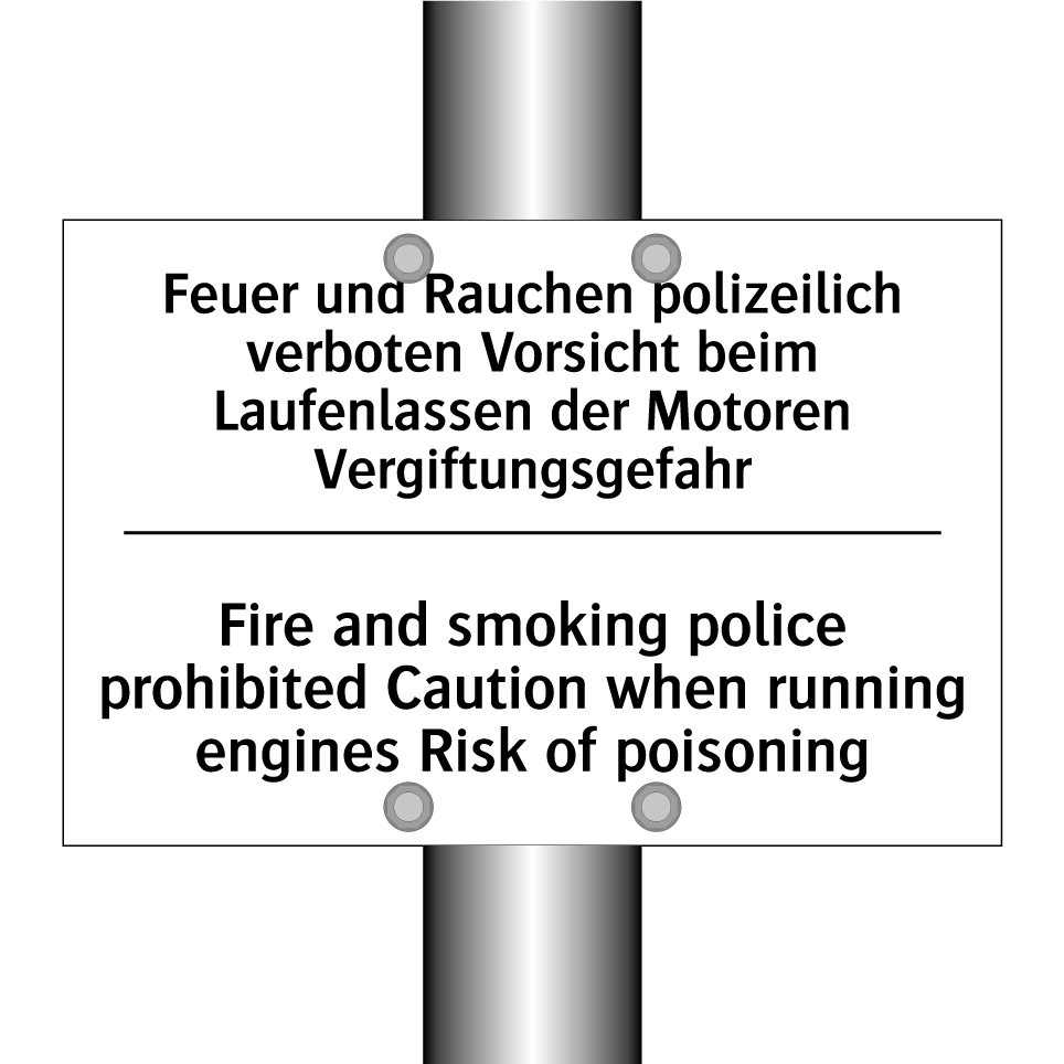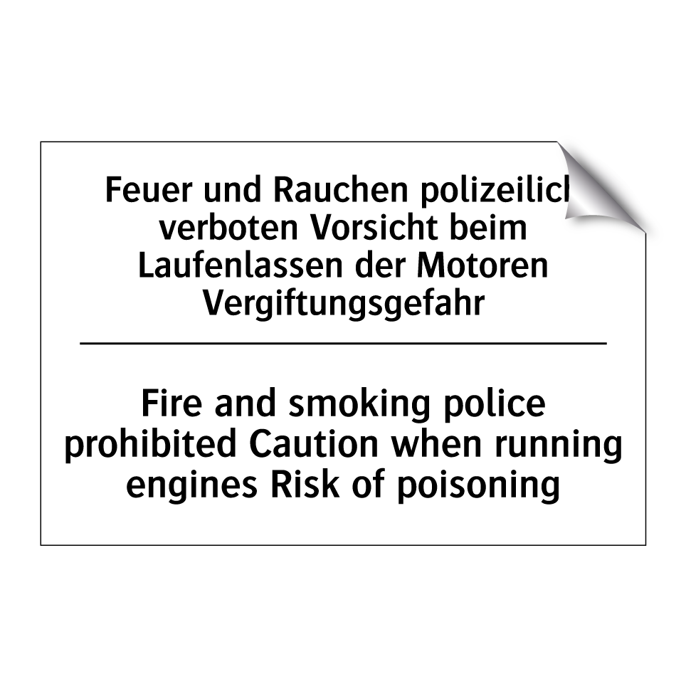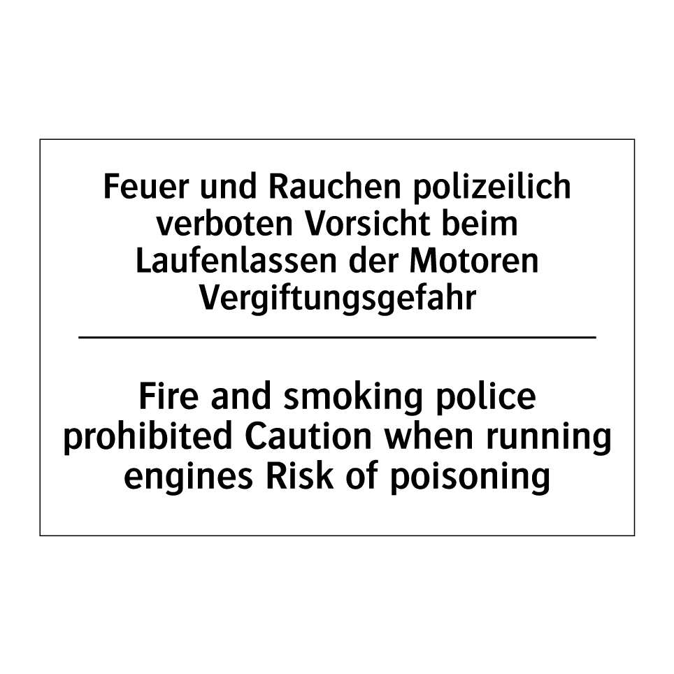Zweisprachiges Verbotsschild mit deutschem Text Feuer und Rauchen polizeilich verboten Vorsicht beim Laufenlassen der Motoren Vergiftungsgefahr und englischem Text Fire and smoking police prohibited Caution when running engines Risk of poisoning
