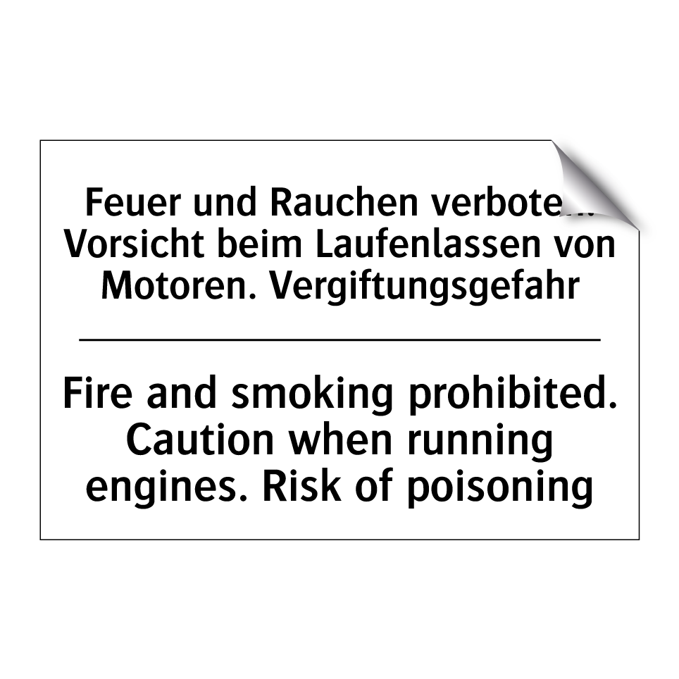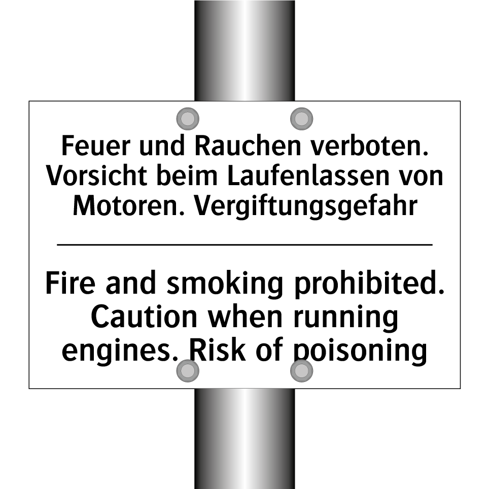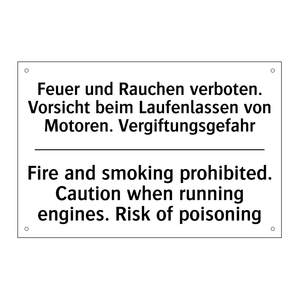 Zweisprachiges Verbotsschild mit deutschem Text Feuer und Rauchen verboten. Vorsicht beim Laufenlassen von Motoren. Vergiftungsgefahr und englischem Text Fire and smoking prohibited. Caution when running engines. Risk of poisoning