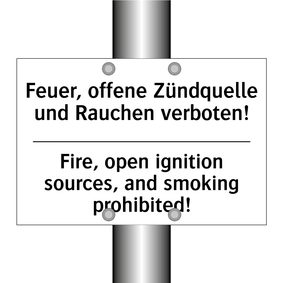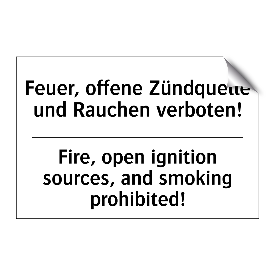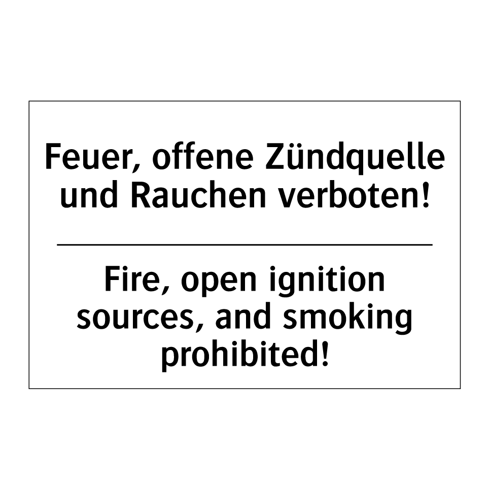 Zweisprachiges Verbotsschild mit deutschem Text Feuer, offene Zündquelle und Rauchen verboten! und englischem Text Fire, open ignition sources, and smoking prohibited!