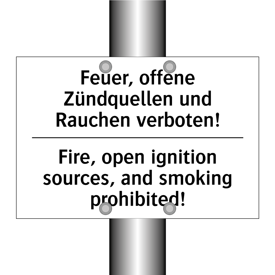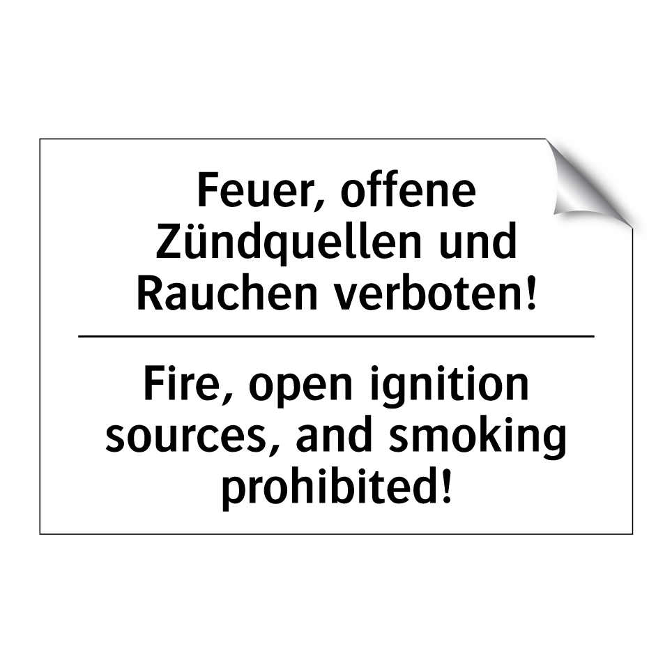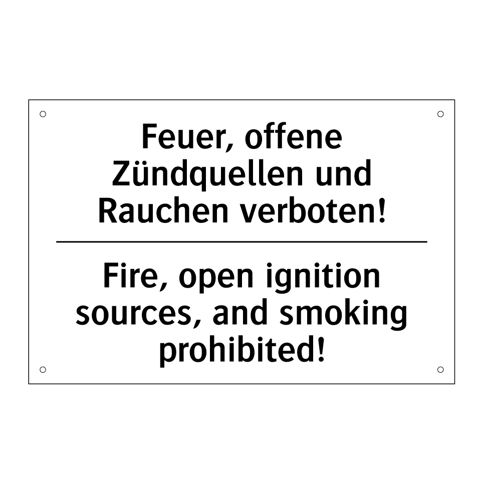 Zweisprachiges Verbotsschild mit deutschem Text Feuer, offene Zündquellen und Rauchen verboten! und englischem Text Fire, open ignition sources, and smoking prohibited!