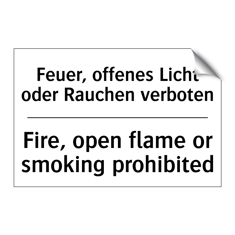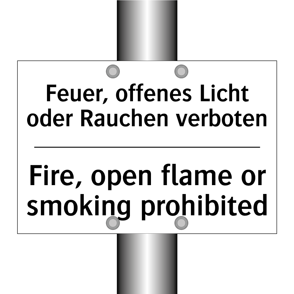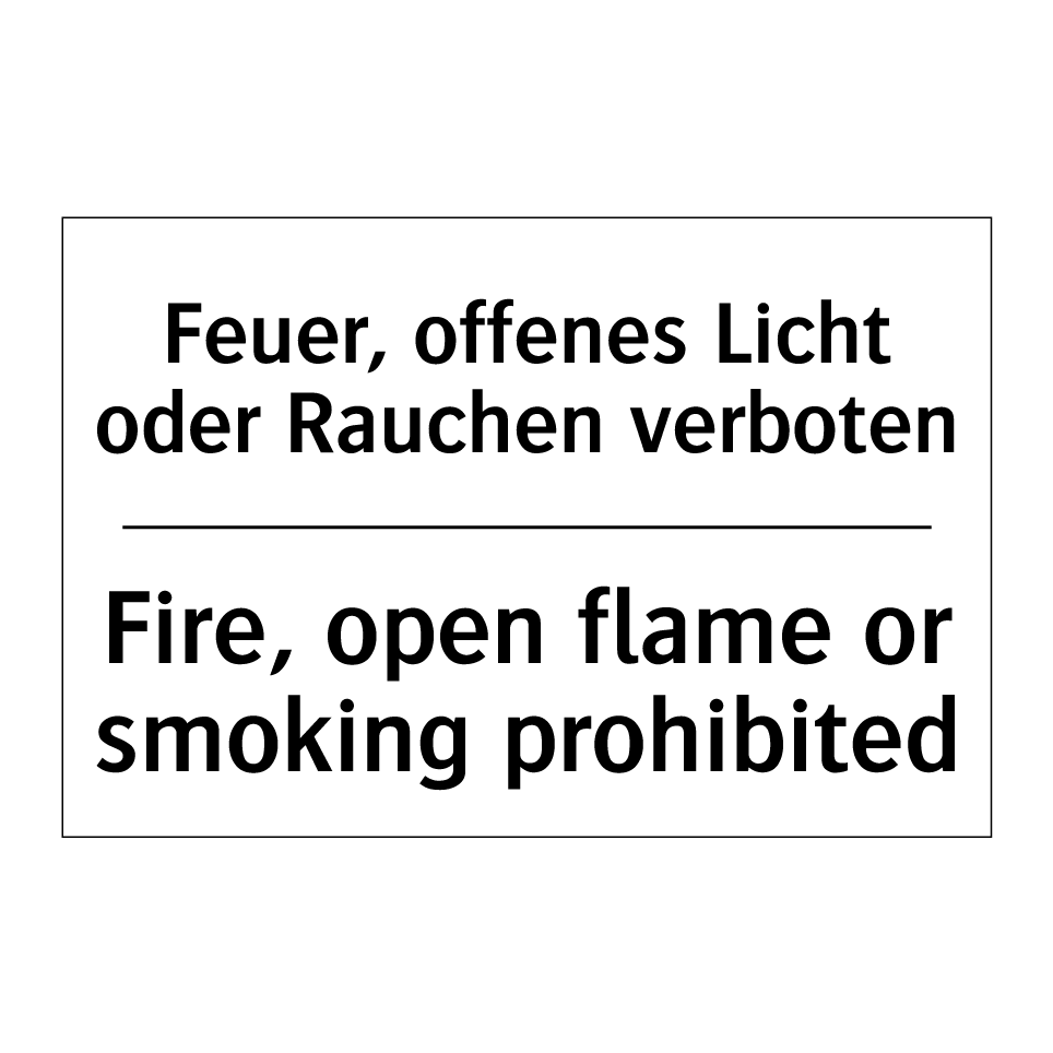 Zweisprachiges Verbotsschild mit deutschem Text Feuer, offenes Licht oder Rauchen verboten und englischem Text Fire, open flame or smoking prohibited