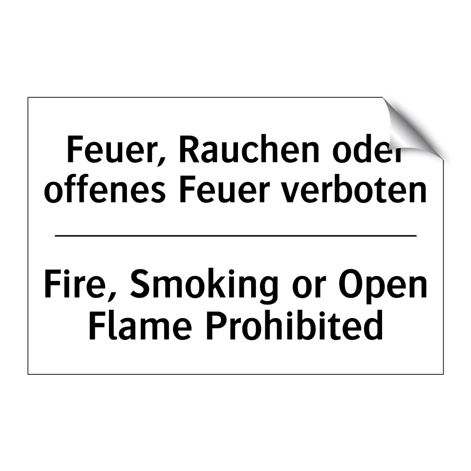 Zweisprachiges Verbotsschild mit deutschem Text Feuer, Rauchen oder offenes Feuer verboten und englischem Text Fire, Smoking or Open Flame Prohibited