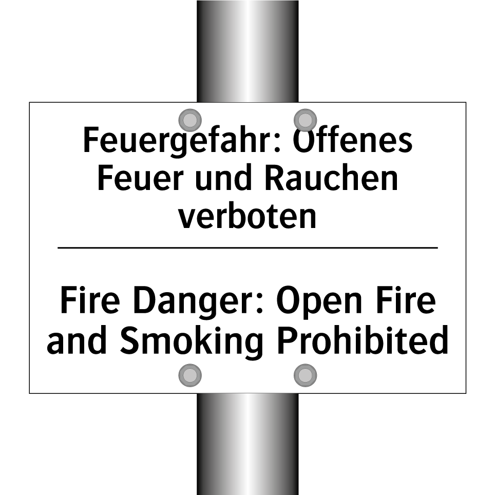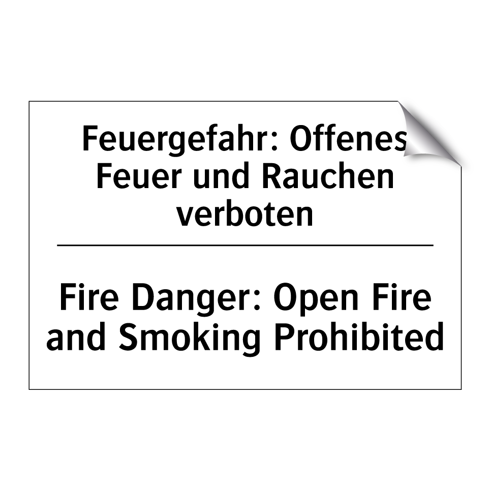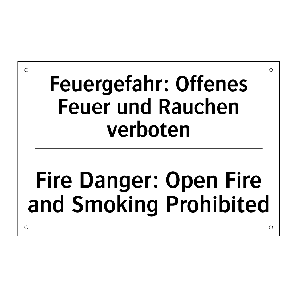 Zweisprachiges Verbotsschild mit deutschem Text Feuergefahr: Offenes Feuer und Rauchen verboten und englischem Text Fire Danger: Open Fire and Smoking Prohibited