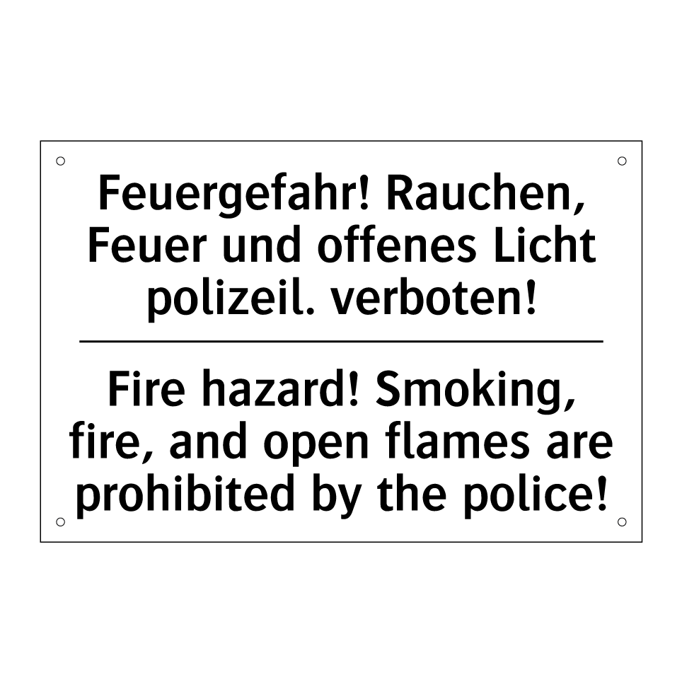 Zweisprachiges Verbotsschild mit deutschem Text Feuergefahr! Rauchen, Feuer und offenes Licht polizeil. verboten! und englischem Text Fire hazard! Smoking, fire, and open flames are prohibited by the police!