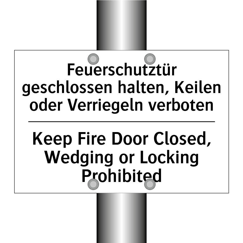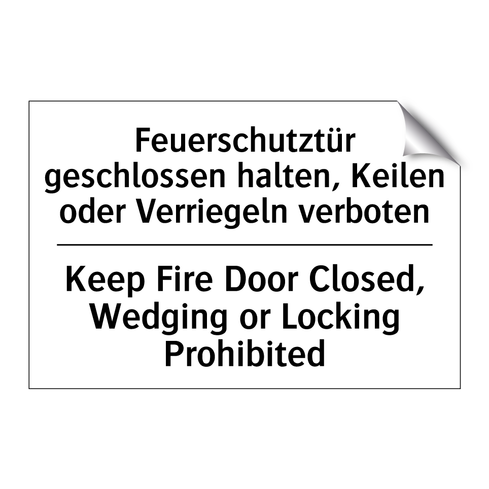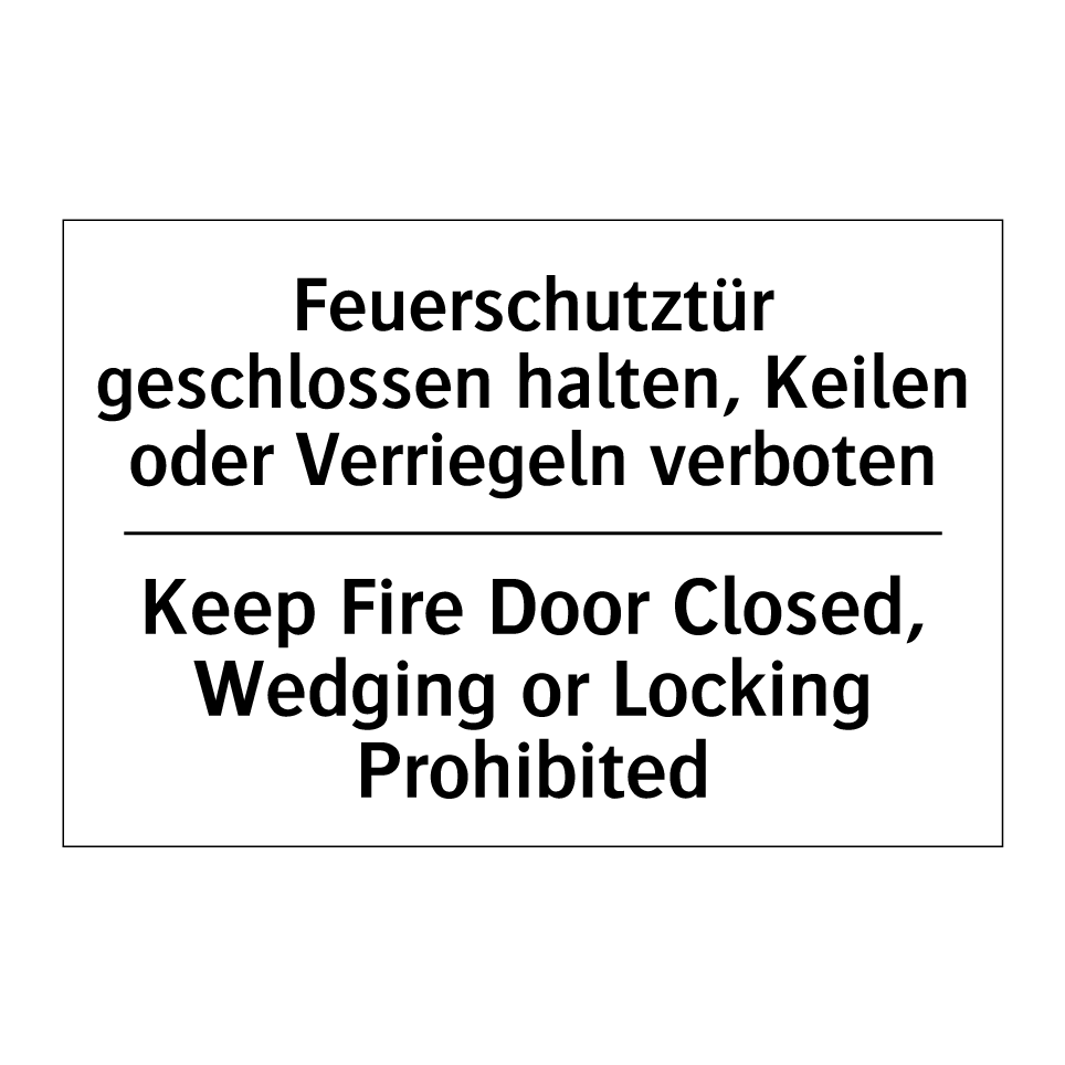 Zweisprachiges Verbotsschild mit deutschem Text Feuerschutztür geschlossen halten, Keilen oder Verriegeln verboten und englischem Text Keep Fire Door Closed, Wedging or Locking Prohibited