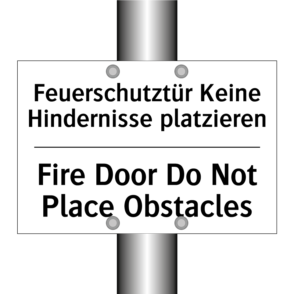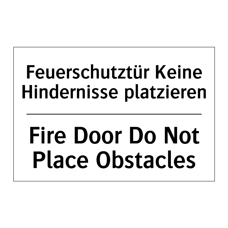 Zweisprachiges Verbotsschild mit deutschem Text Feuerschutztür Keine Hindernisse platzieren und englischem Text Fire Door Do Not Place Obstacles