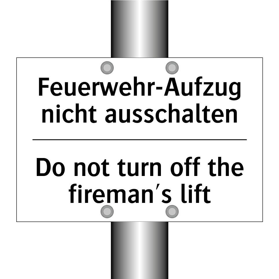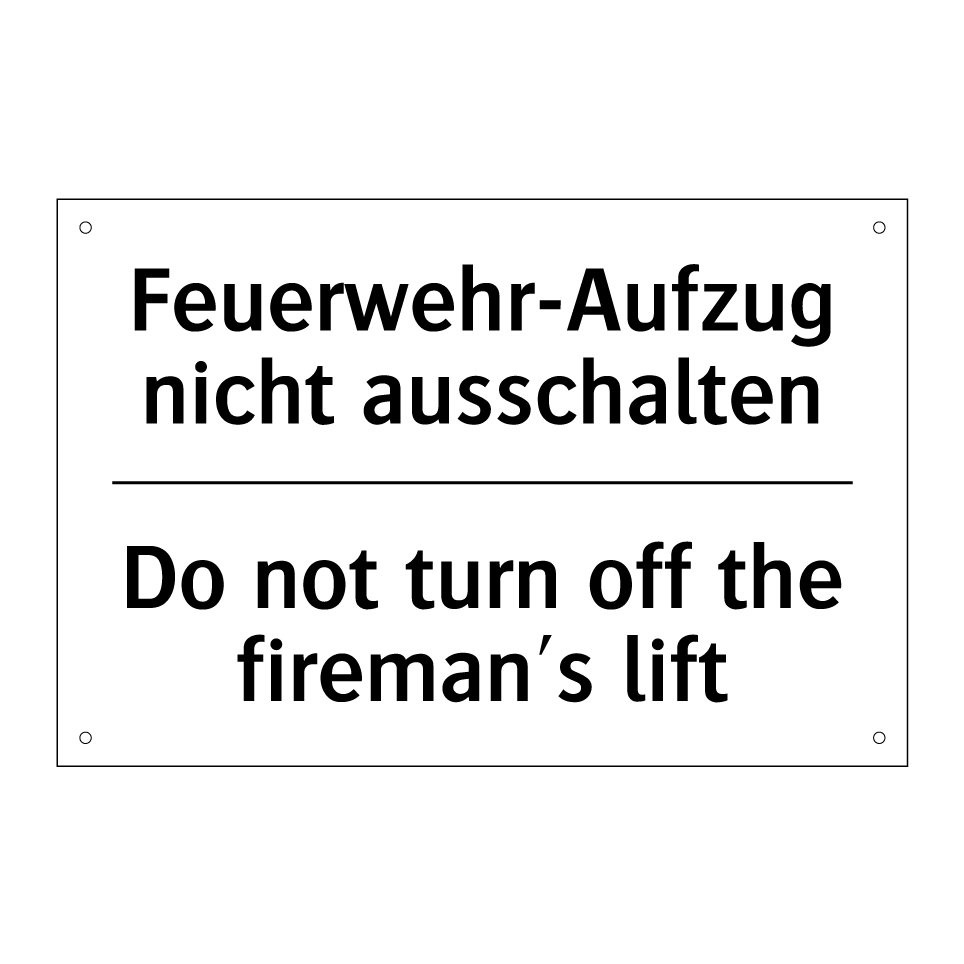 Zweisprachiges Verbotsschild mit deutschem Text Feuerwehr-Aufzug nicht ausschalten und englischem Text Do not turn off the fireman's lift