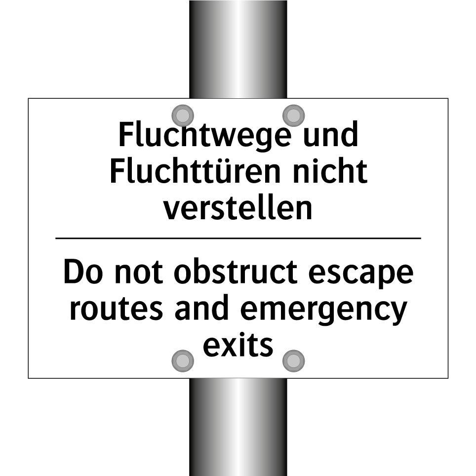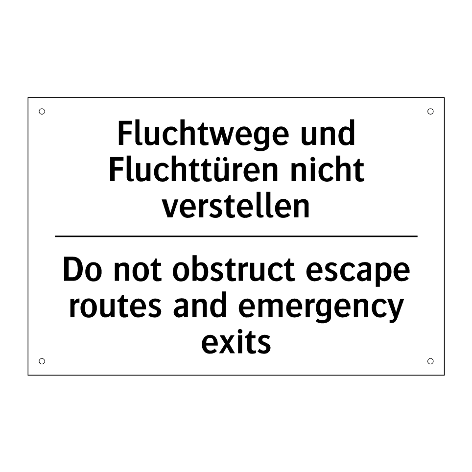 Zweisprachiges Verbotsschild mit deutschem Text Fluchtwege und Fluchttüren nicht verstellen und englischem Text Do not obstruct escape routes and emergency exits