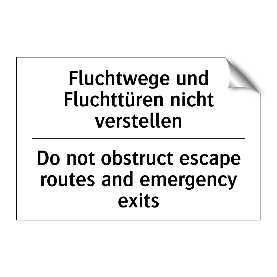 Diese zweisprachige Verbotsschild ist ideal für den Einsatz in Bereichen, in denen Fluchtwege und Notausgänge freigehalten werden müssen. Mit klarer, leicht verständlicher Beschriftung auf Deutsch und Englisch sorgt sie für internationale Verständlichkeit und erhöht die Sicherheit in öffentlichen und gewerblichen Gebäuden. Platzieren Sie diese Verbotsschilder in Korridoren, an Türen oder in der Nähe von Notausgängen, um sicherzustellen, dass Fluchtwege jederzeit zugänglich bleiben. Die deutliche Botschaft dieser Schilder trägt dazu bei, potenzielle Hindernisse zu vermeiden und die Sicherheit von Mitarbeitern und Besuchern zu gewährleisten. Perfekt für Büros, Lagerhallen, Einkaufszentren und andere stark frequentierte Orte.