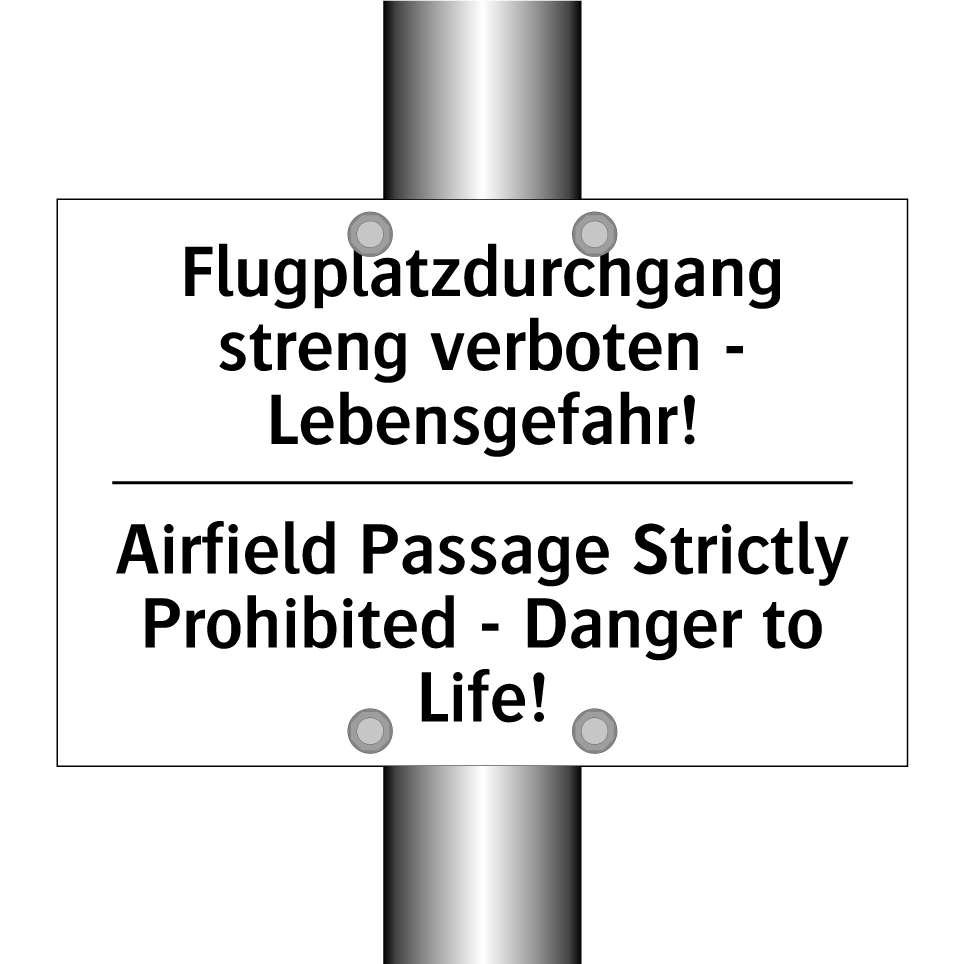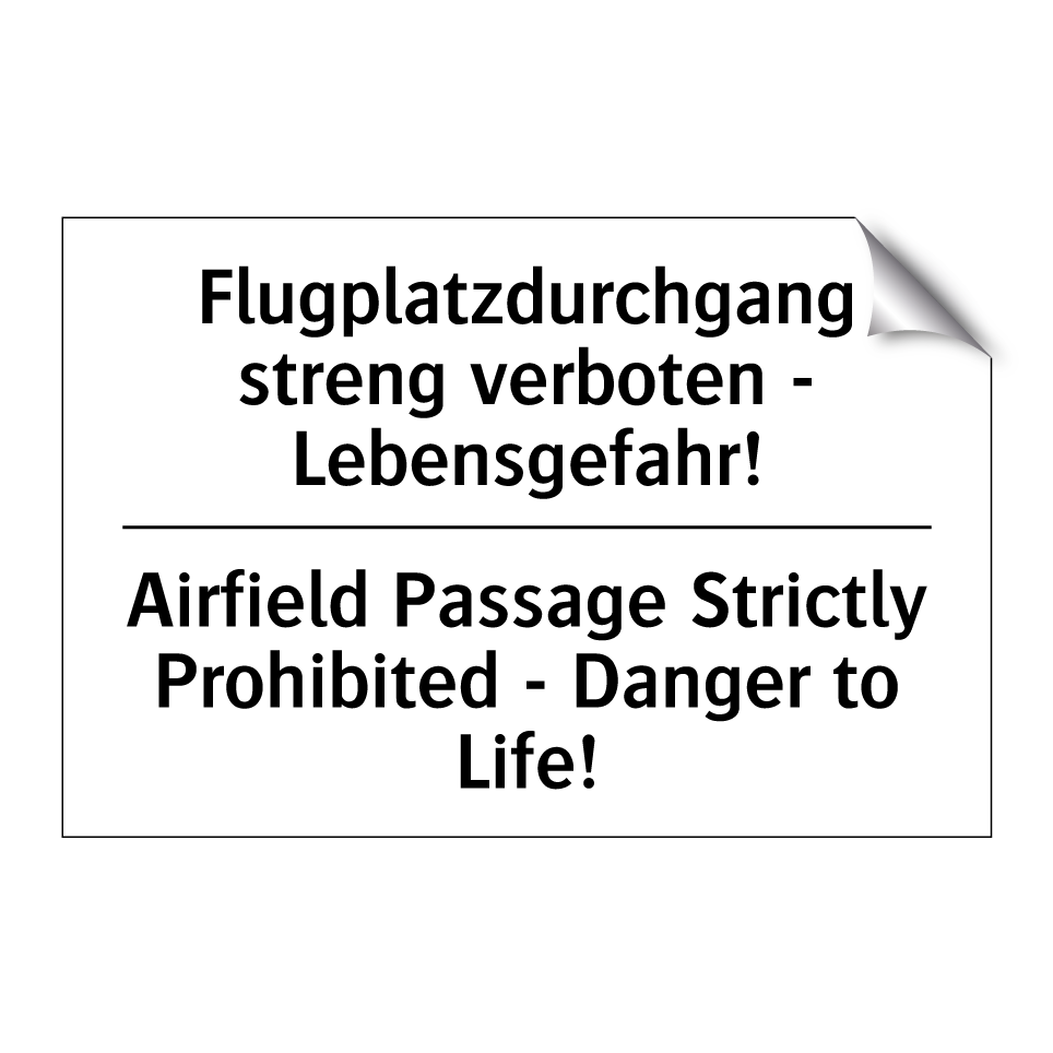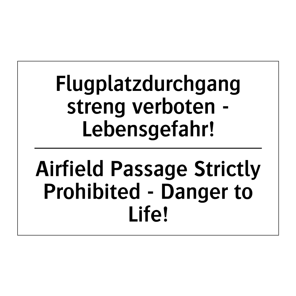 Zweisprachiges Verbotsschild mit deutschem Text Flugplatzdurchgang streng verboten - Lebensgefahr! und englischem Text Airfield Passage Strictly Prohibited - Danger to Life!