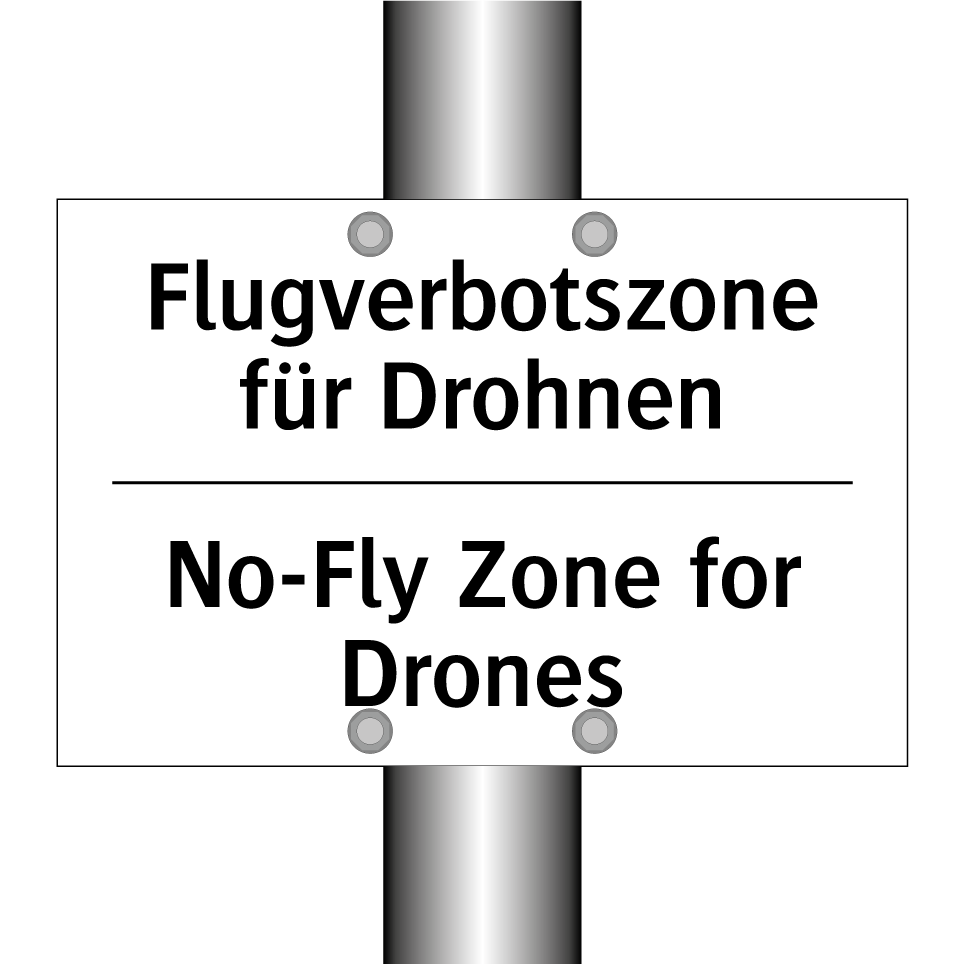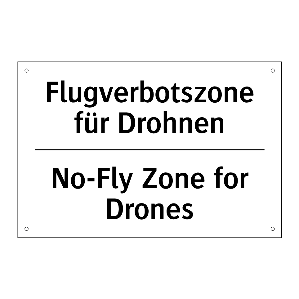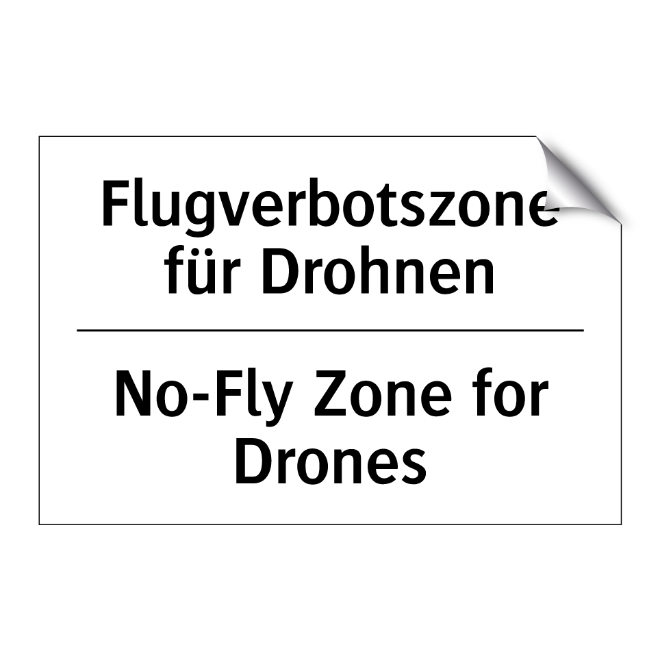 Zweisprachiges Verbotsschild mit deutschem Text Flugverbotszone für Drohnen und englischem Text No-Fly Zone for Drones
