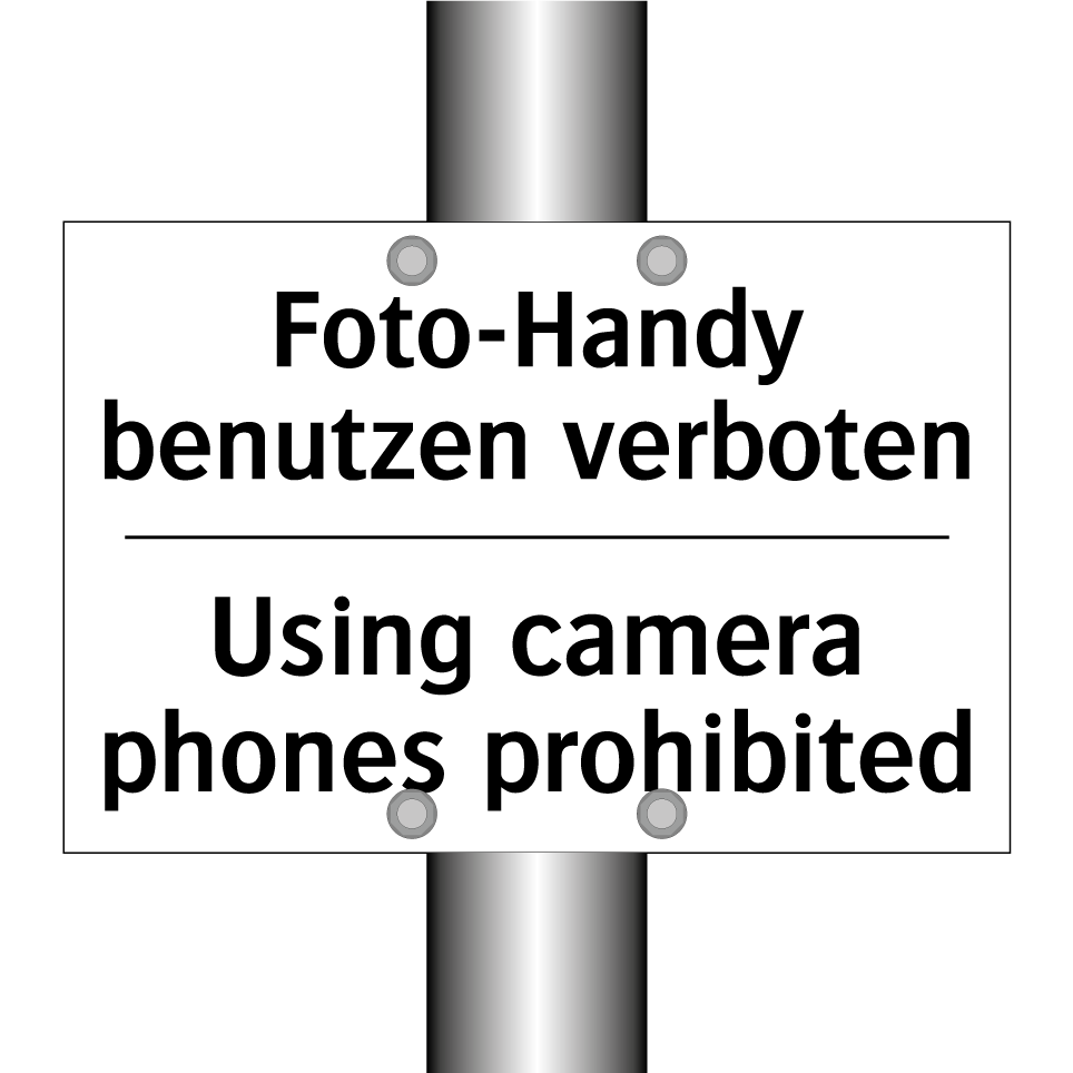 Zweisprachiges Verbotsschild mit deutschem Text Foto-Handy benutzen verboten und englischem Text Using camera phones prohibited