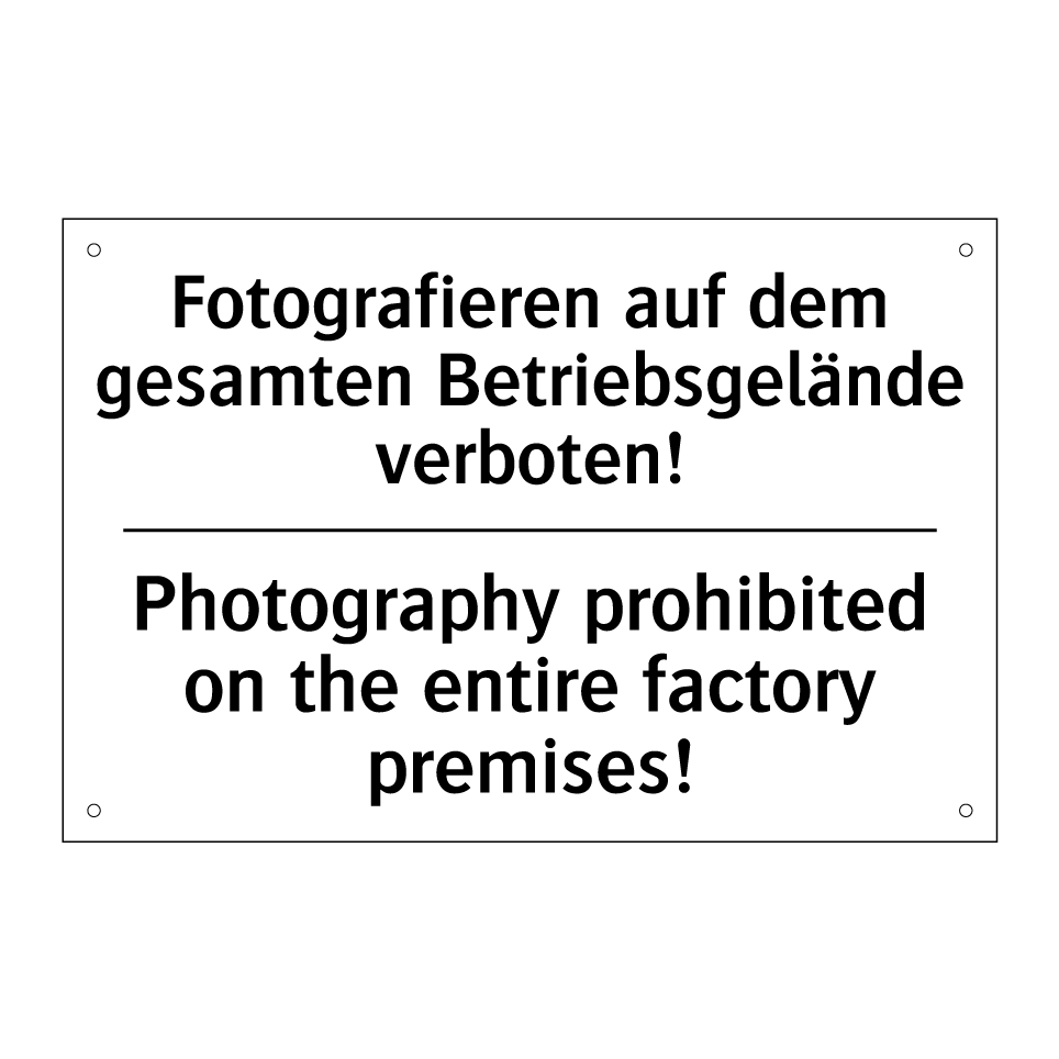 Zweisprachiges Verbotsschild mit deutschem Text Fotografieren auf dem gesamten Betriebsgelände verboten! und englischem Text Photography prohibited on the entire factory premises!