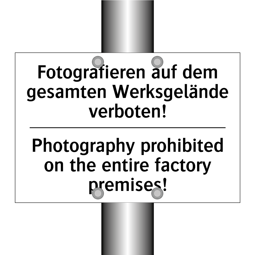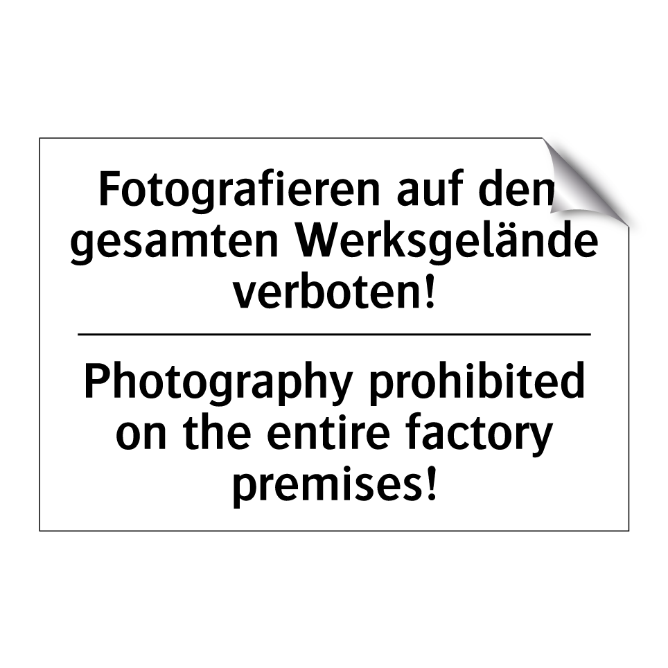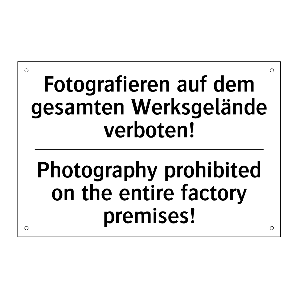 Zweisprachiges Verbotsschild mit deutschem Text Fotografieren auf dem gesamten Werksgelände verboten! und englischem Text Photography prohibited on the entire factory premises!