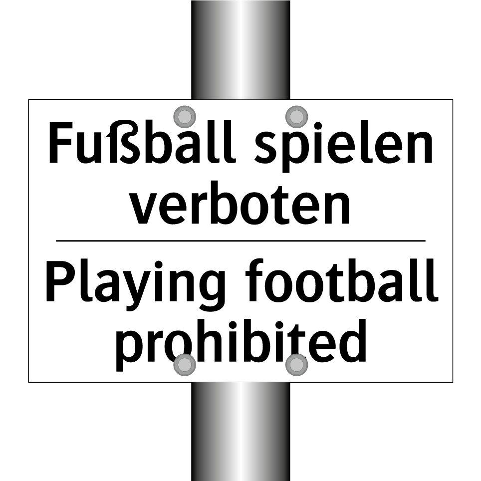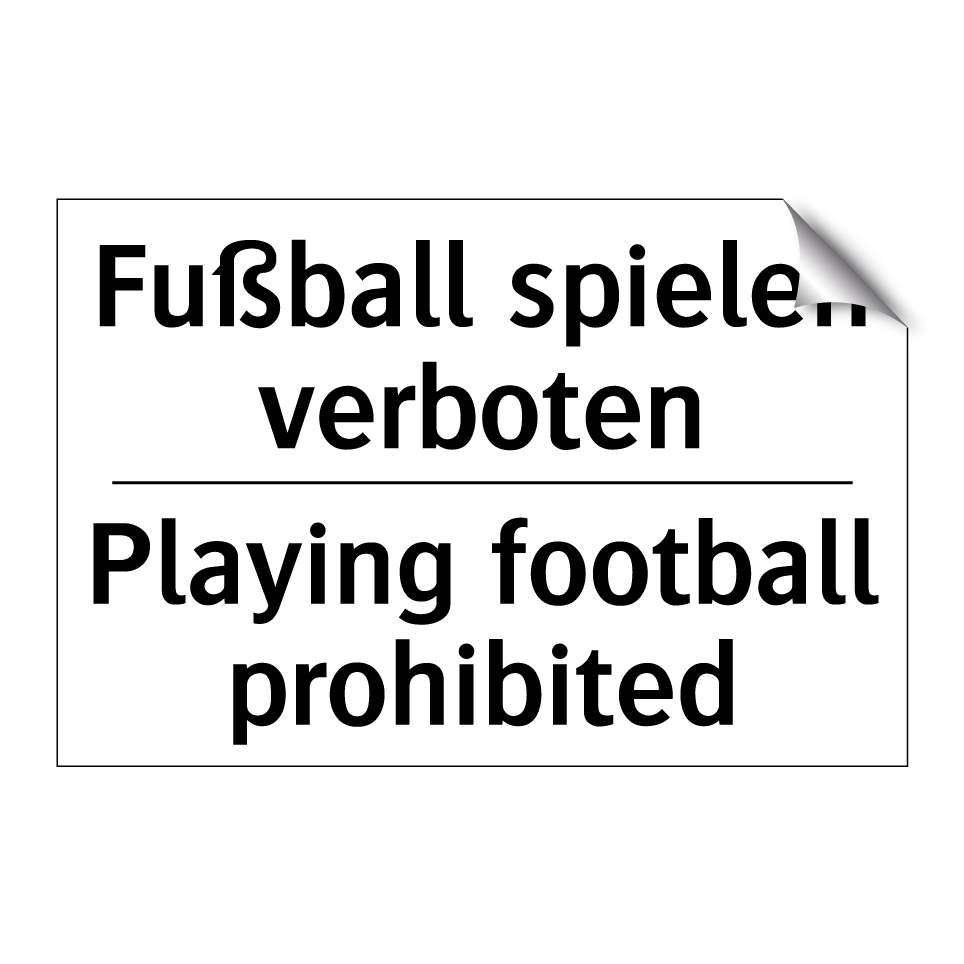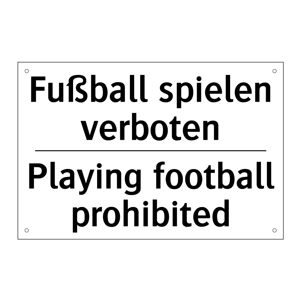Zweisprachiges Verbotsschild mit deutschem Text Fußball spielen verboten und englischem Text Playing football prohibited