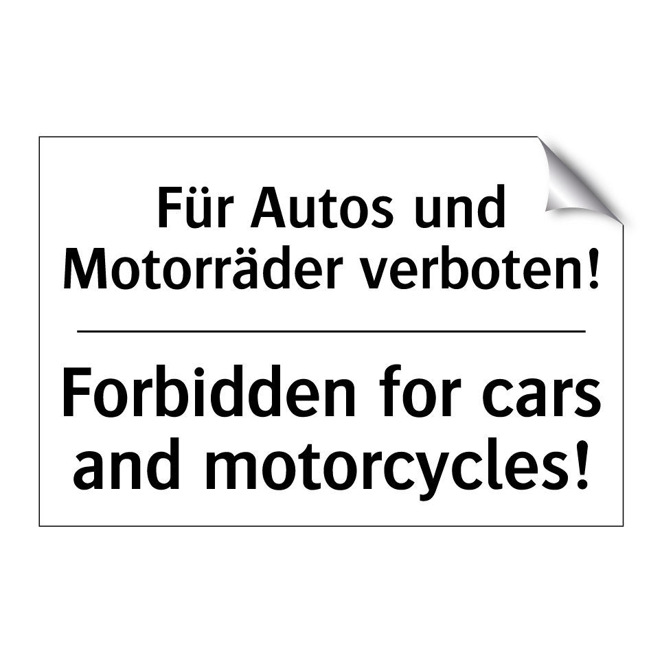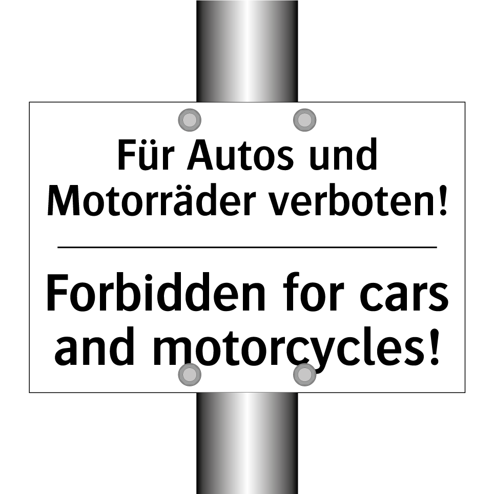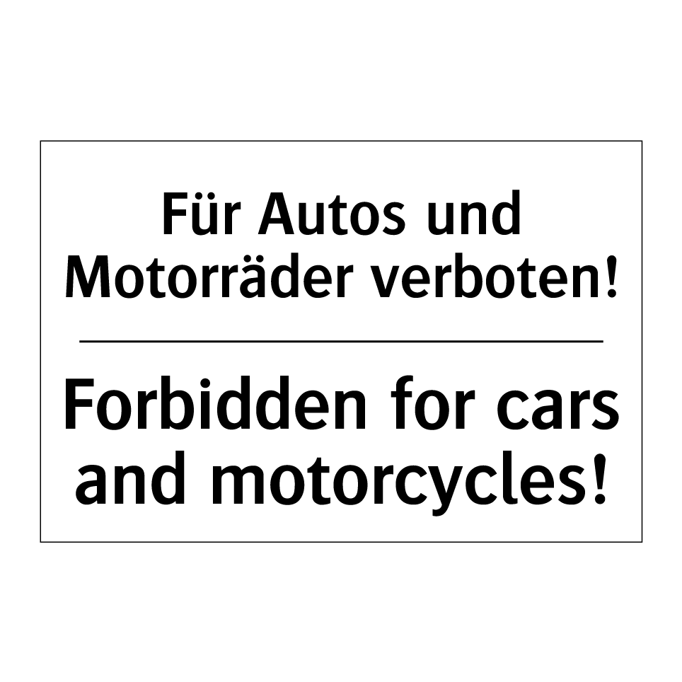Zweisprachiges Verbotsschild mit deutschem Text Für Autos und Motorräder verboten! und englischem Text Forbidden for cars and motorcycles!