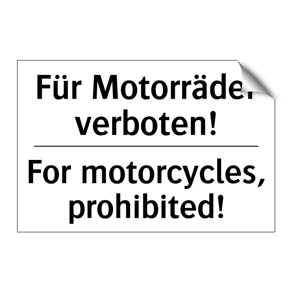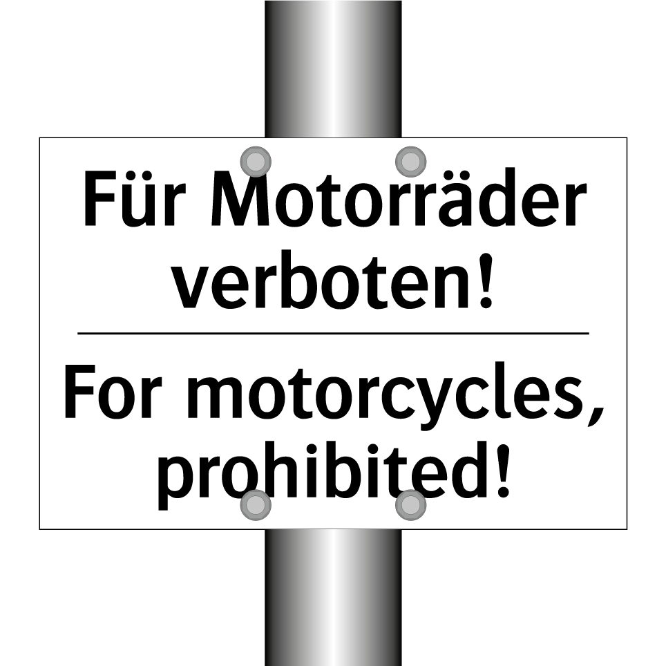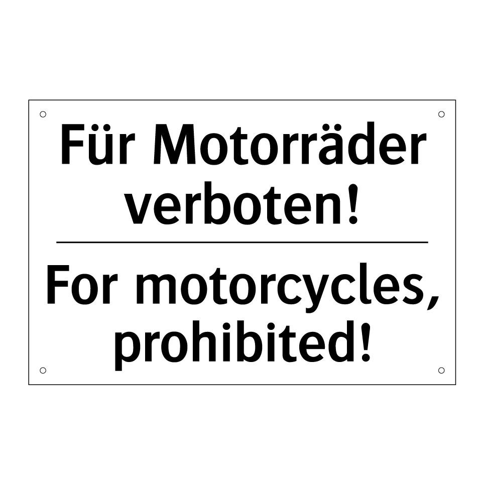 Zweisprachiges Verbotsschild mit deutschem Text Für Motorräder verboten! und englischem Text For motorcycles, prohibited!