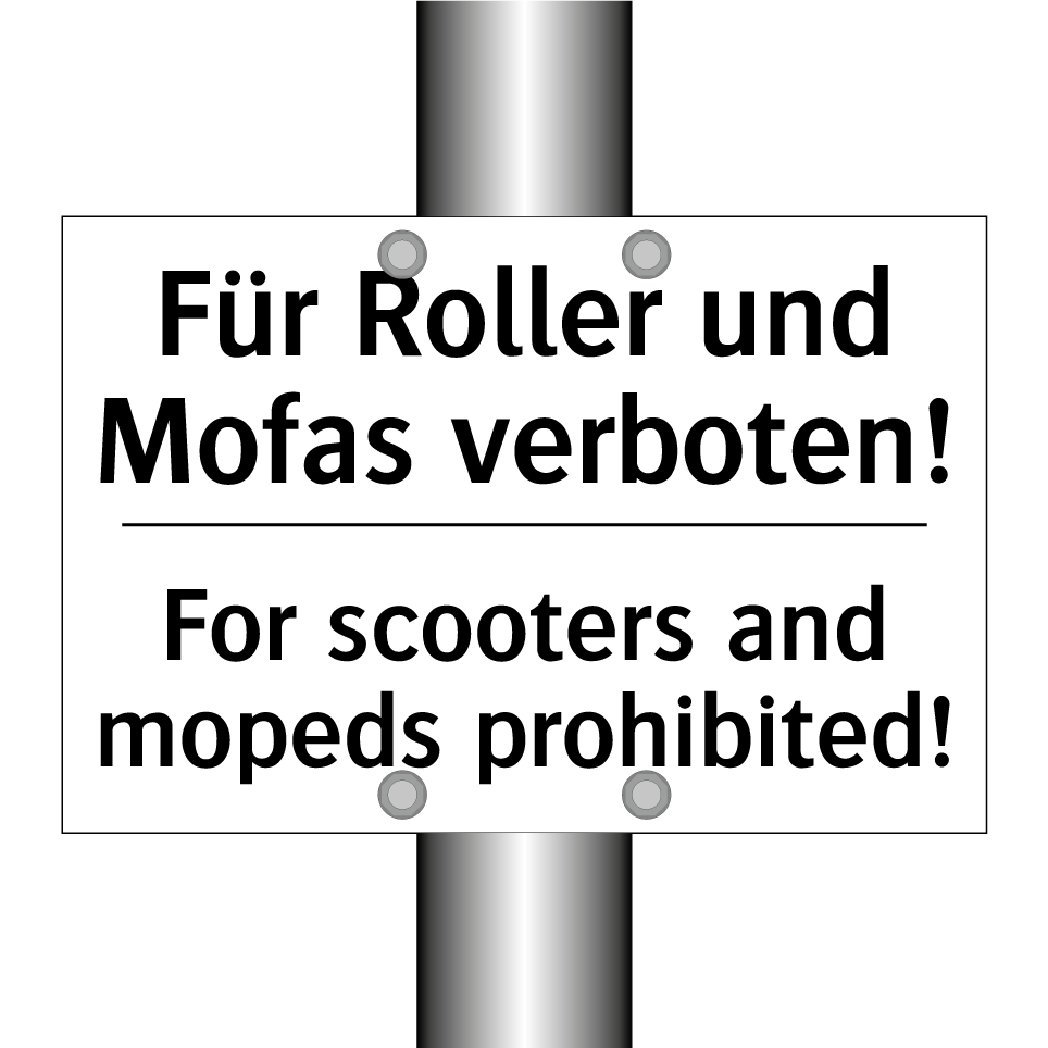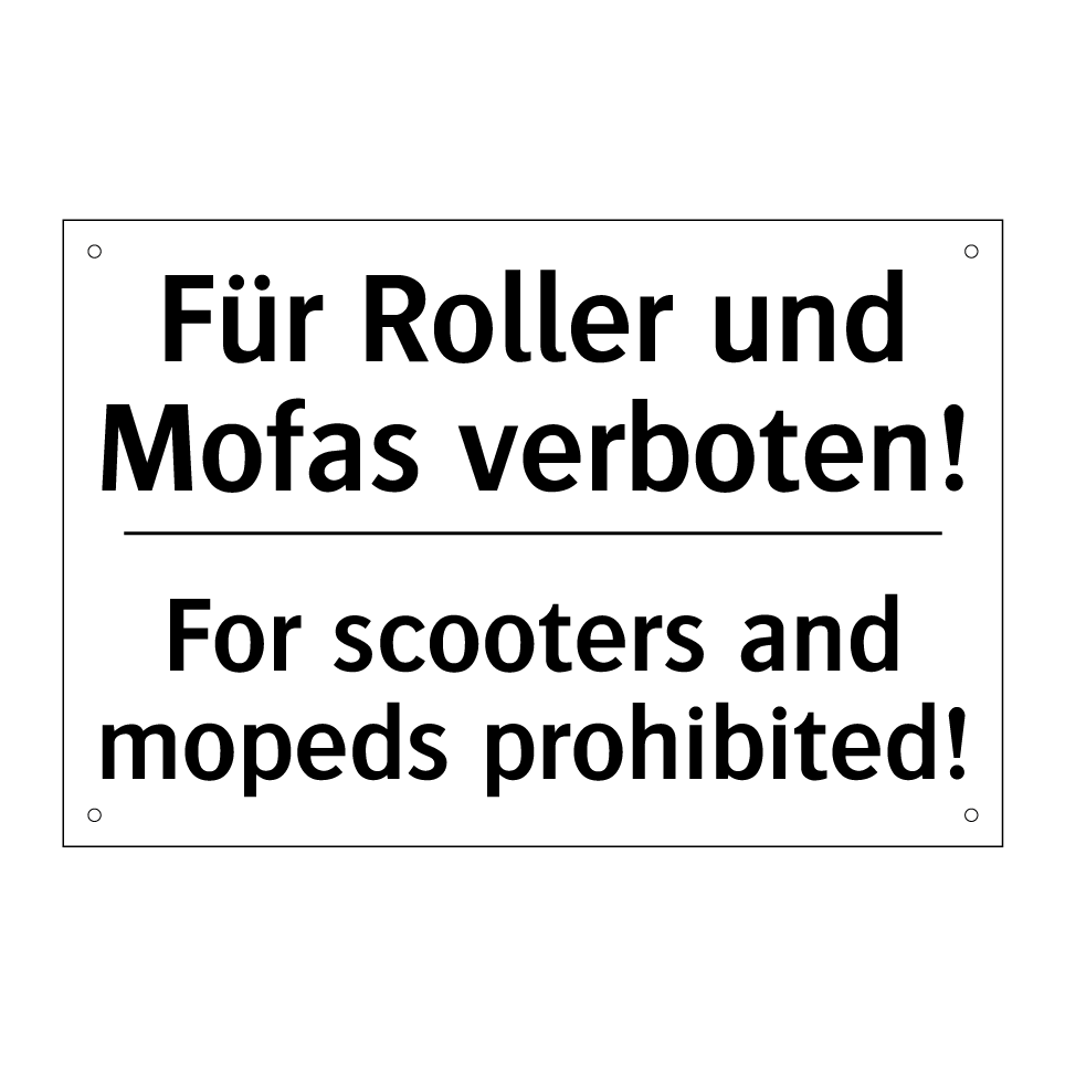 Zweisprachiges Verbotsschild mit deutschem Text Für Roller und Mofas verboten! und englischem Text For scooters and mopeds prohibited!