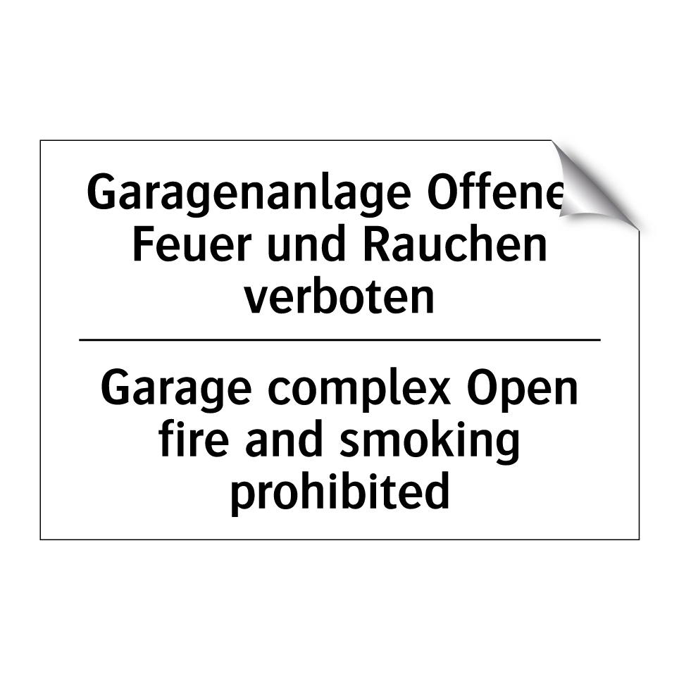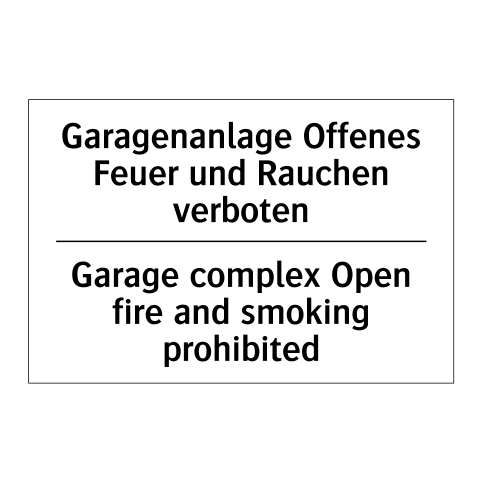 Zweisprachiges Verbotsschild mit deutschem Text Garagenanlage Offenes Feuer und Rauchen verboten und englischem Text Garage complex Open fire and smoking prohibited
