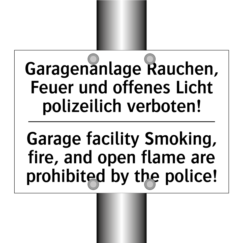 Zweisprachiges Verbotsschild mit deutschem Text Garagenanlage Rauchen, Feuer und offenes Licht polizeilich verboten! und englischem Text Garage facility Smoking, fire, and open flame are prohibited by the police!