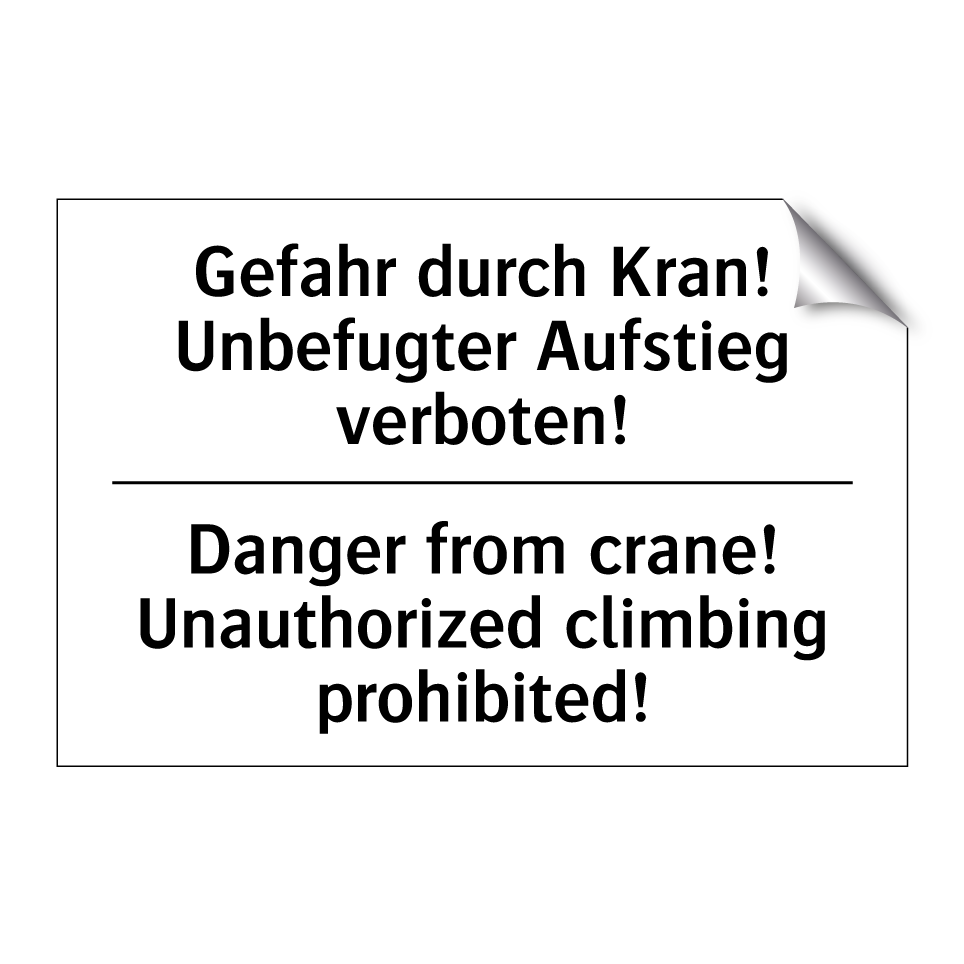 Zweisprachiges Verbotsschild mit deutschem Text Gefahr durch Kran! Unbefugter Aufstieg verboten! und englischem Text Danger from crane! Unauthorized climbing prohibited!