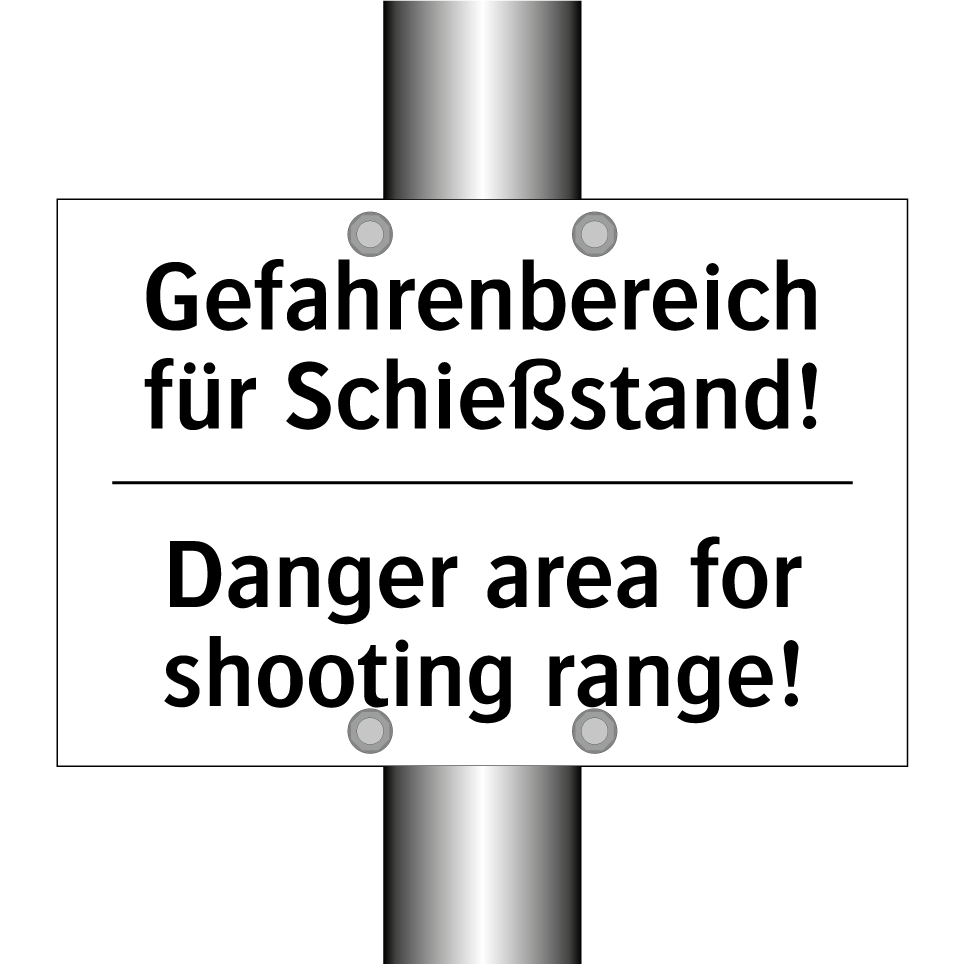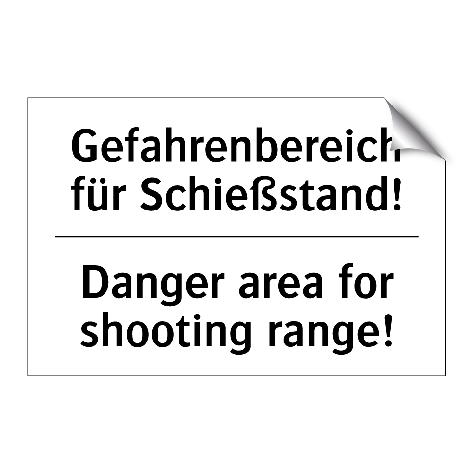 Zweisprachiges Verbotsschild mit deutschem Text Gefahrenbereich für Schießstand! und englischem Text Danger area for shooting range!