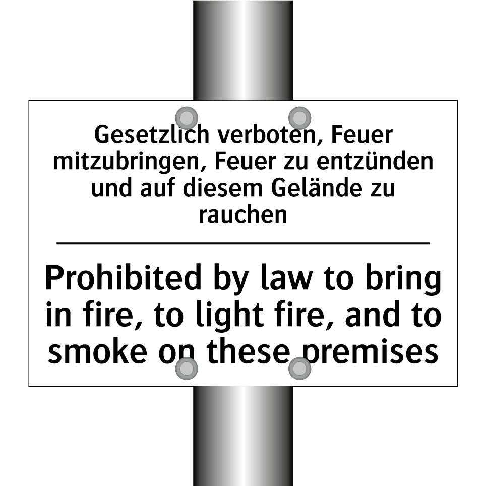 Zweisprachiges Verbotsschild mit deutschem Text Gesetzlich verboten, Feuer mitzubringen, Feuer zu entzünden und auf diesem Gelände zu rauchen und englischem Text Prohibited by law to bring in fire, to light fire, and to smoke on these premises