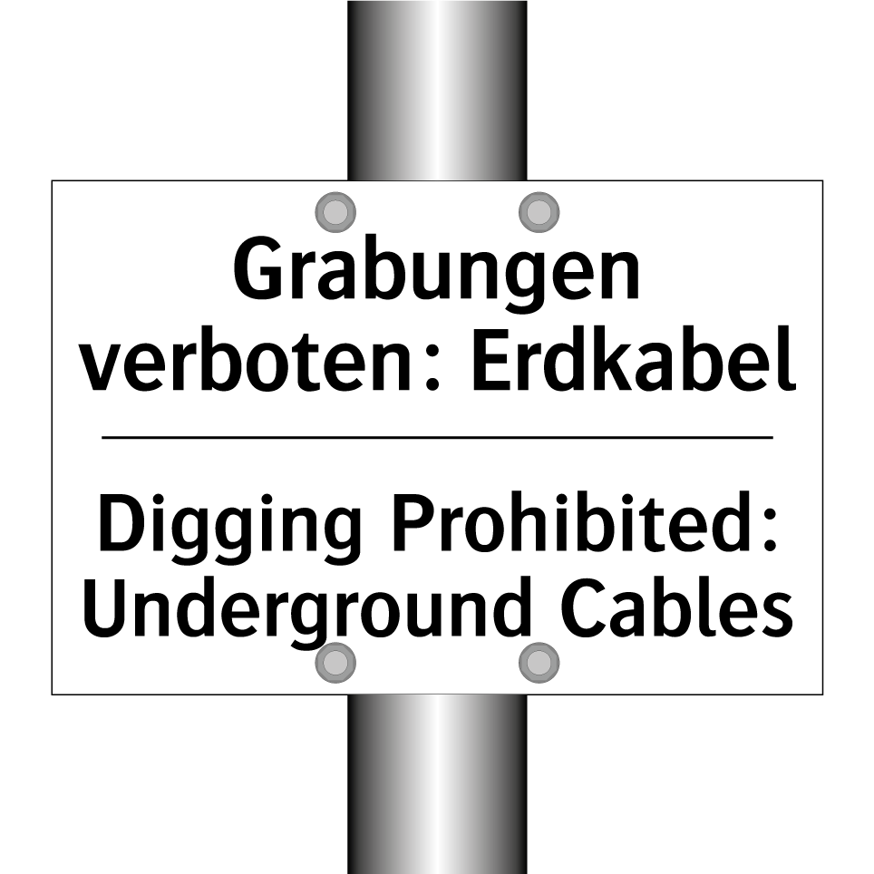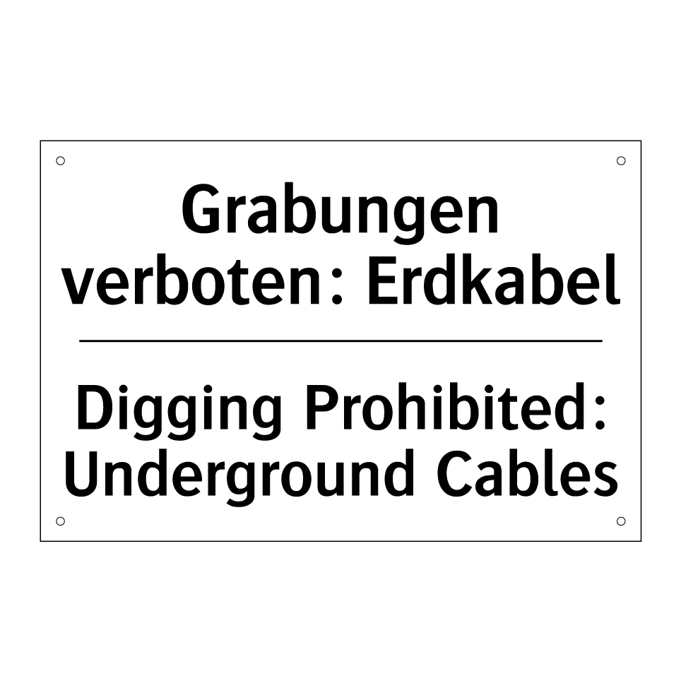 Zweisprachiges Verbotsschild mit deutschem Text Grabungen verboten: Erdkabel und englischem Text Digging Prohibited: Underground Cables