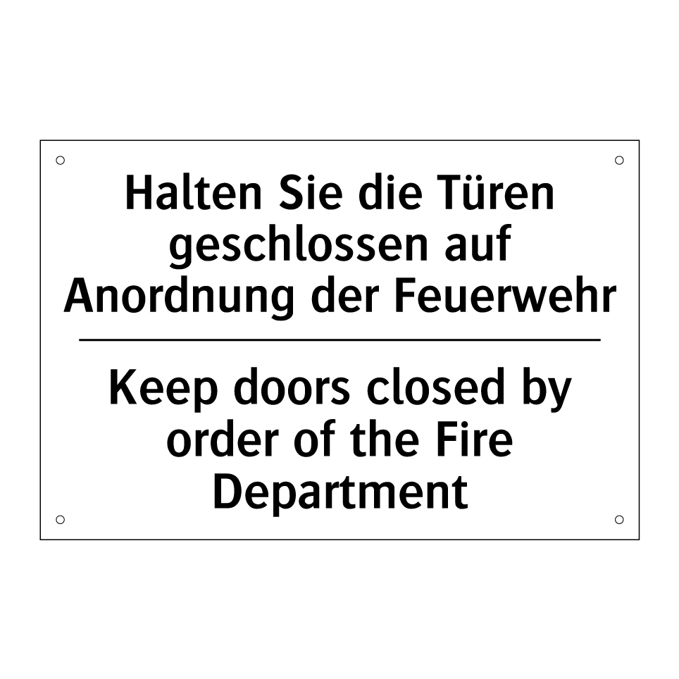 Zweisprachiges Verbotsschild mit deutschem Text Halten Sie die Türen geschlossen auf Anordnung der Feuerwehr und englischem Text Keep doors closed by order of the Fire Department