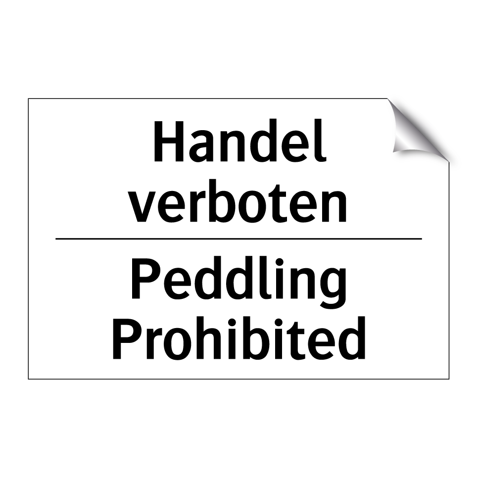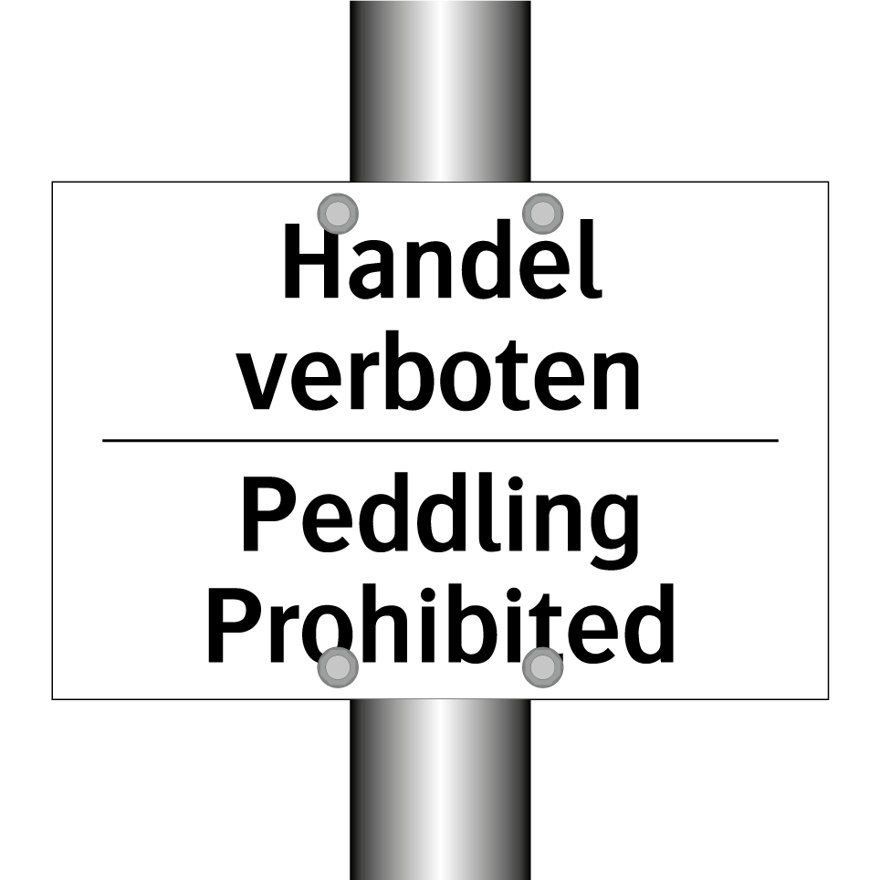Zweisprachiges Verbotsschild mit deutschem Text Handel verboten und englischem Text Peddling Prohibited