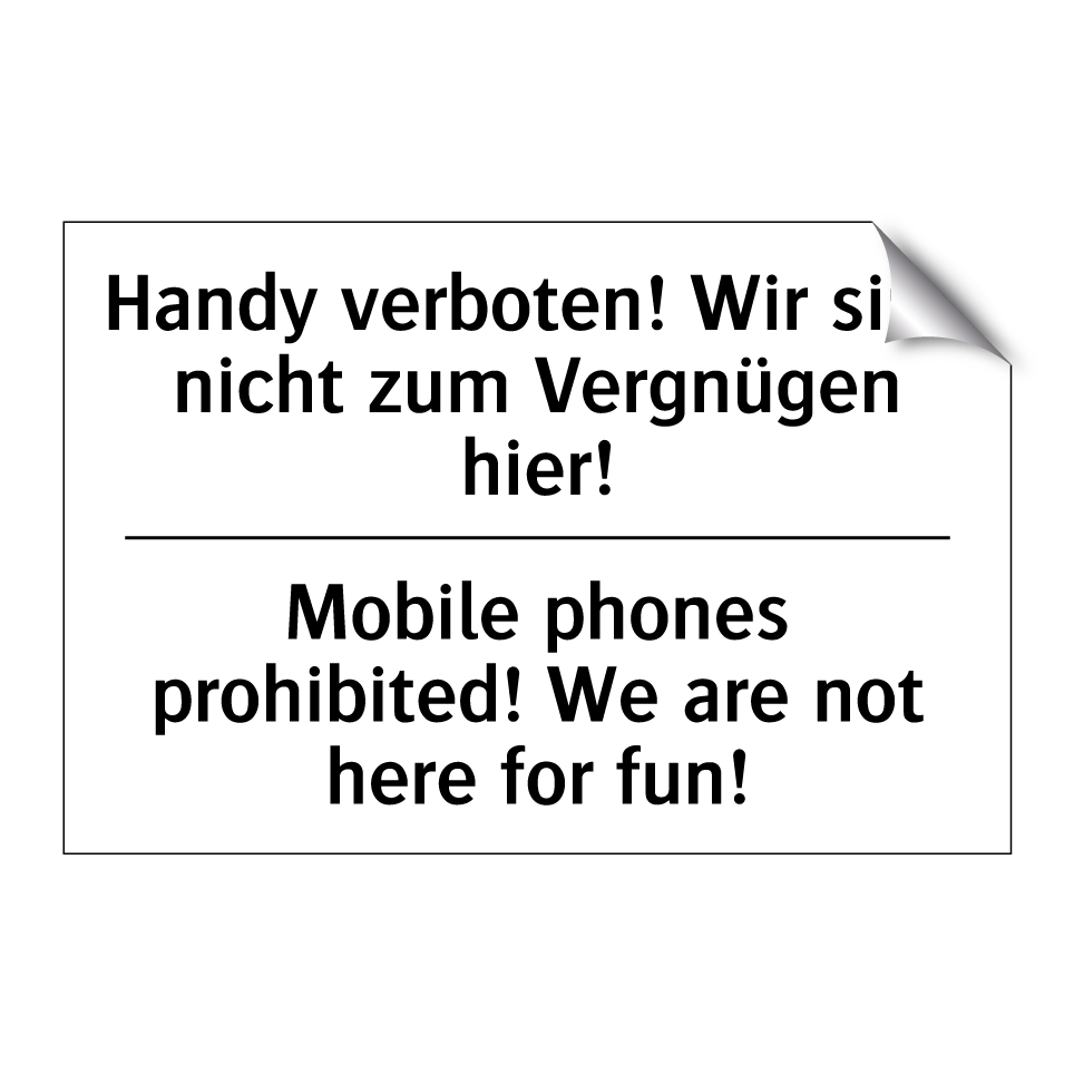 Zweisprachiges Verbotsschild mit deutschem Text Handy verboten! Wir sind nicht zum Vergnügen hier! und englischem Text Mobile phones prohibited! We are not here for fun!