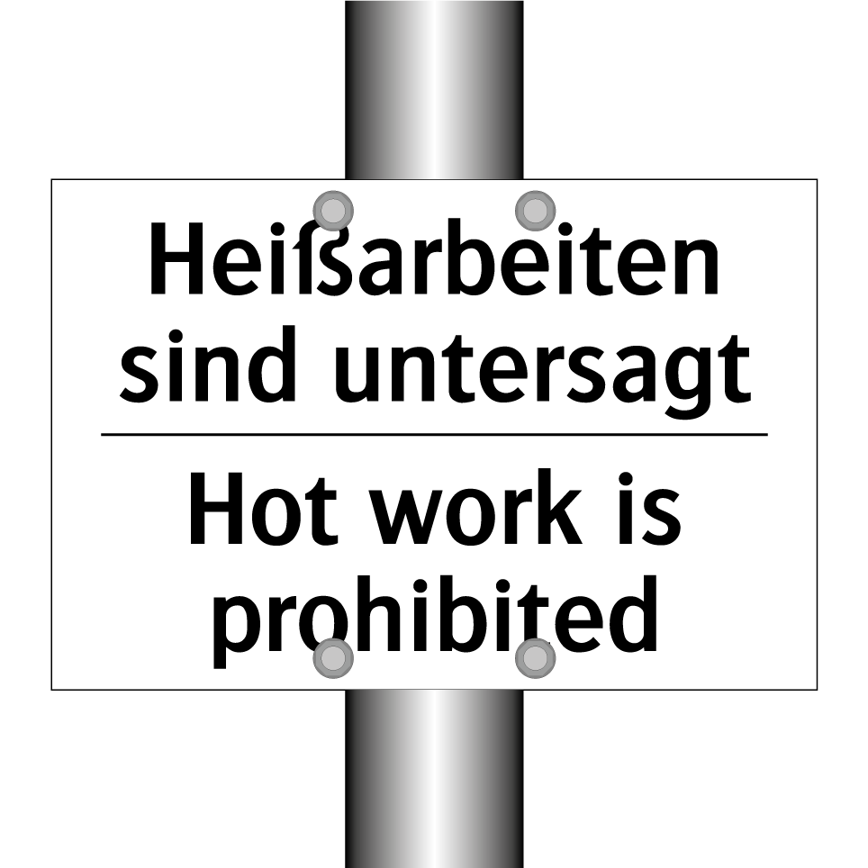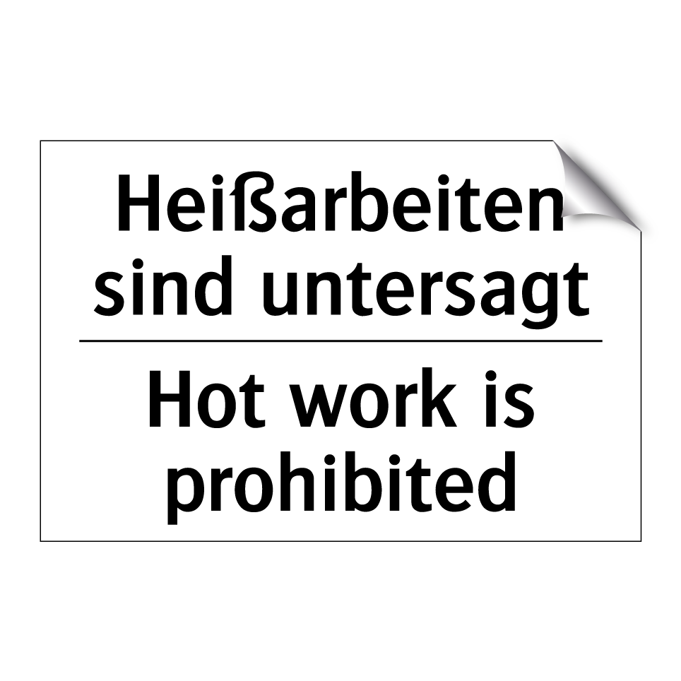 Zweisprachiges Verbotsschild mit deutschem Text Heißarbeiten sind untersagt und englischem Text Hot work is prohibited