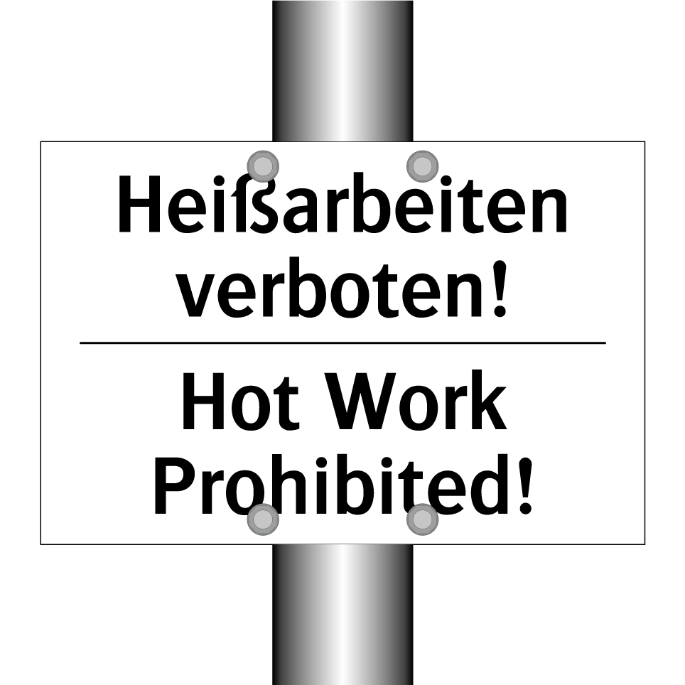 Zweisprachiges Verbotsschild mit deutschem Text Heißarbeiten verboten! und englischem Text Hot Work Prohibited!