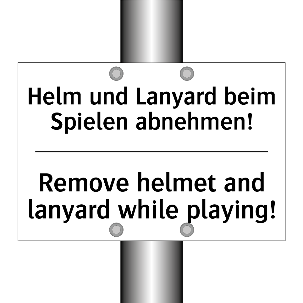 Zweisprachiges Verbotsschild mit deutschem Text Helm und Lanyard beim Spielen abnehmen! und englischem Text Remove helmet and lanyard while playing!