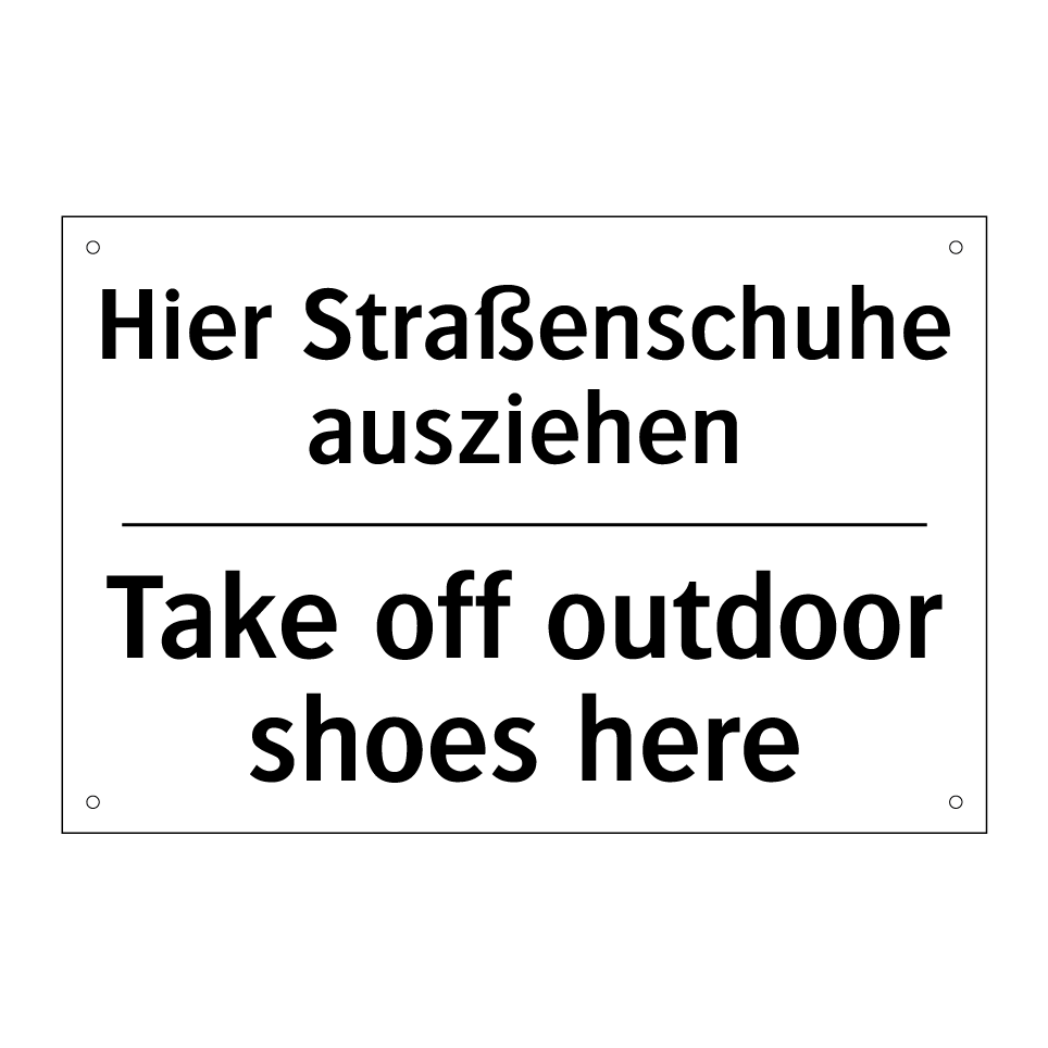 Zweisprachiges Verbotsschild mit deutschem Text Hier Straßenschuhe ausziehen und englischem Text Take off outdoor shoes here